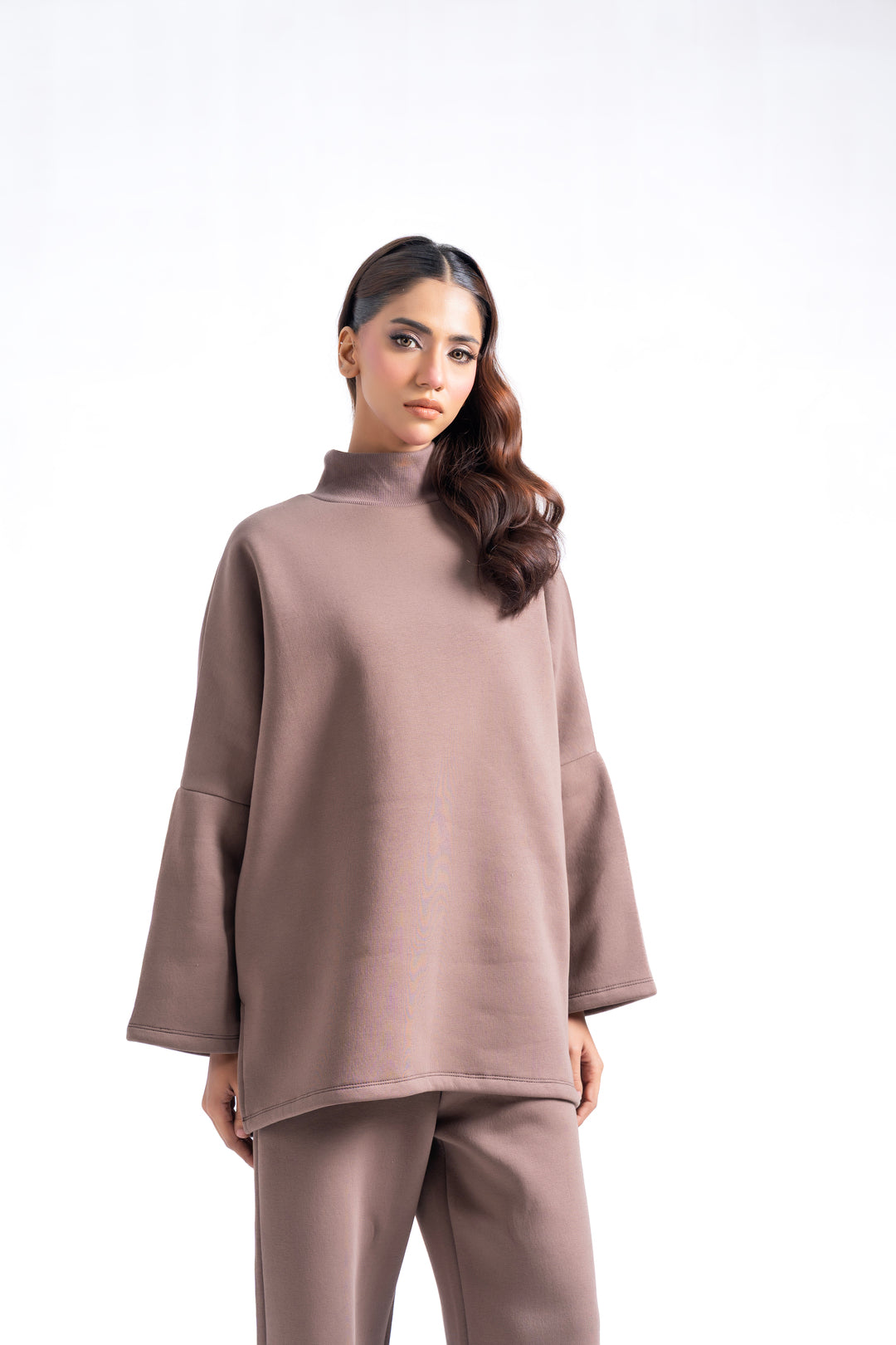 High Neck Fleece Top in a versatile taupe shade, designed with a relaxed loose fit and full sleeves for comfortable everyday wear. The side slit detail adds subtle movement and contemporary styling to this essential layering piece.