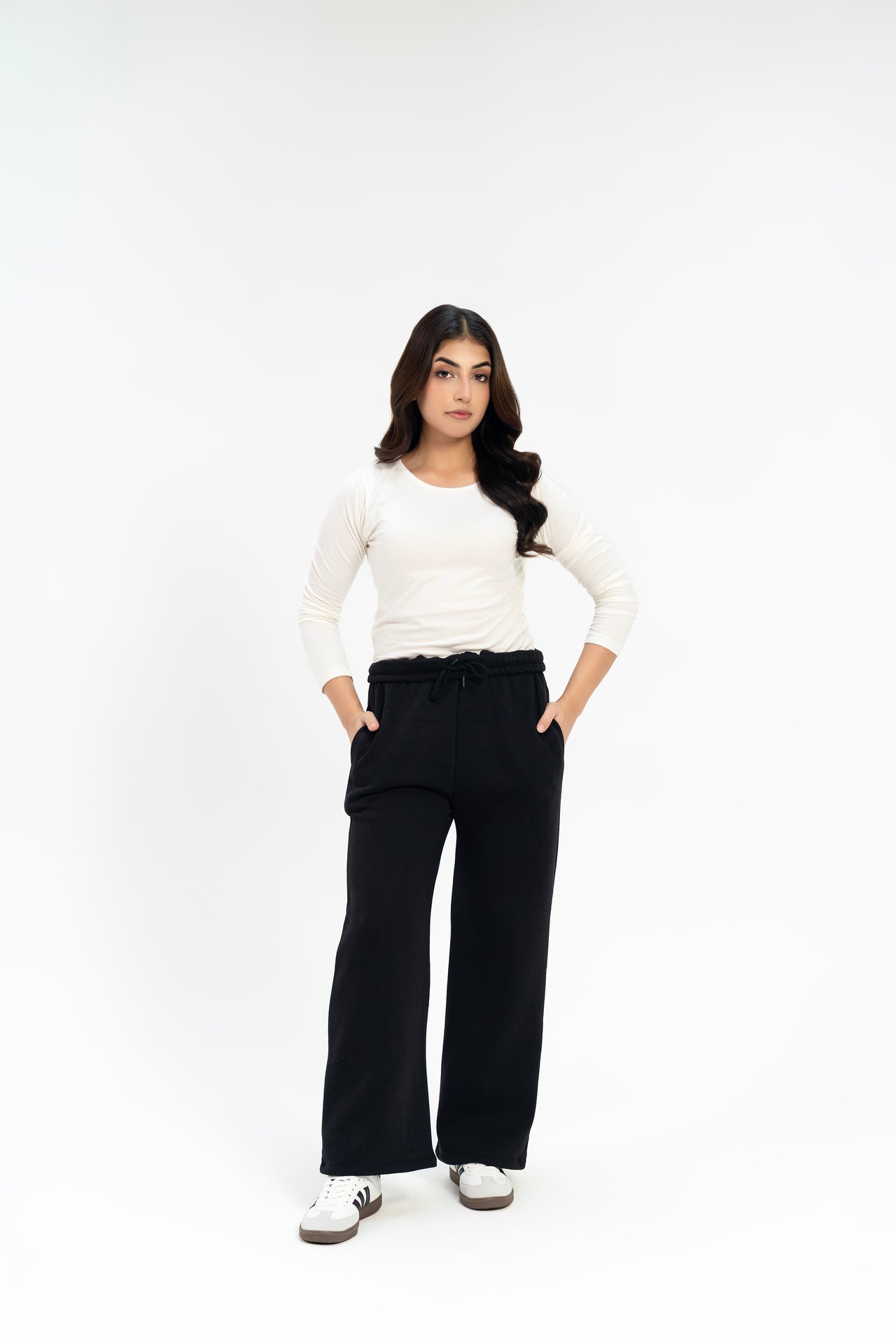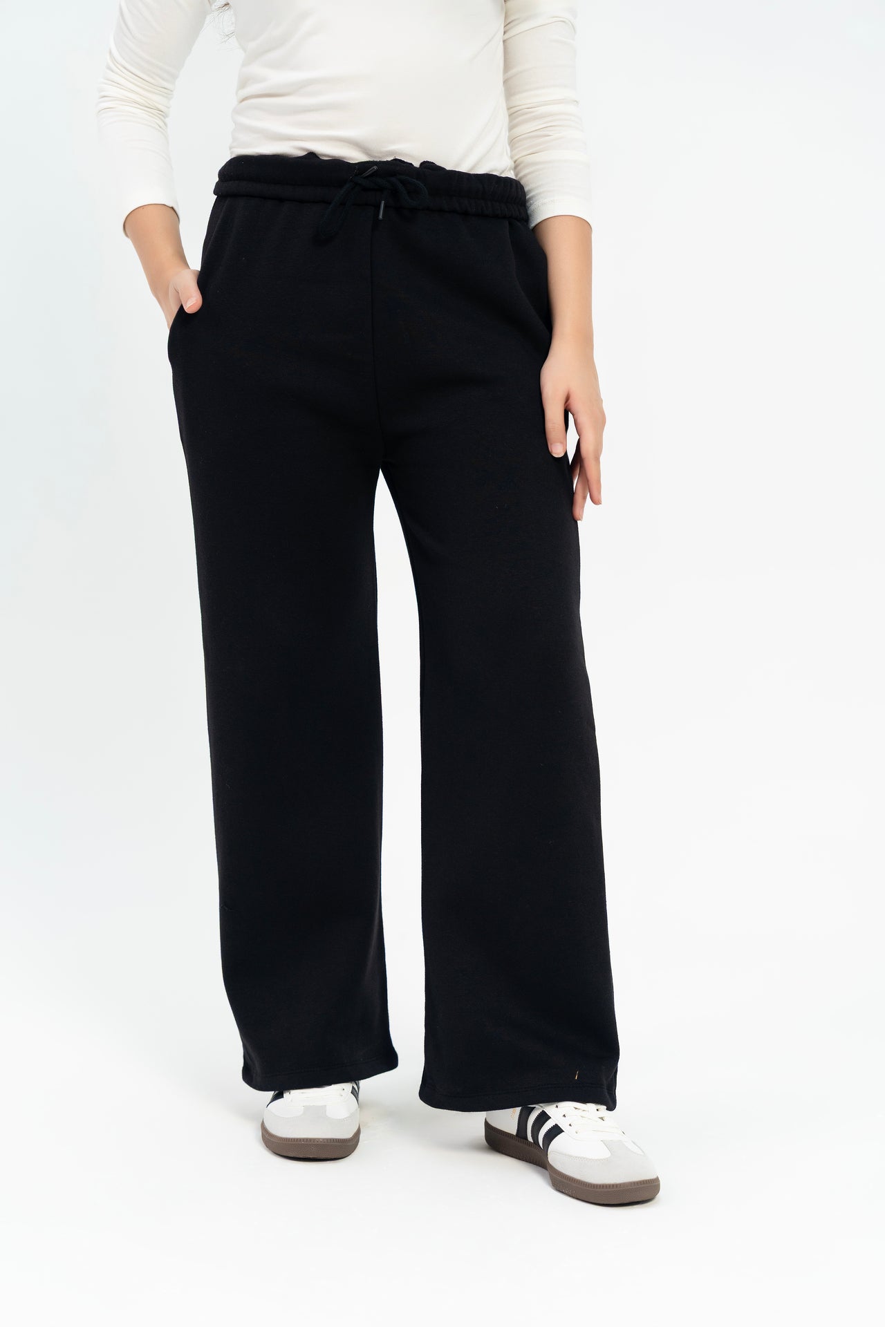 These Black Sweatpants with Drawstring feature an adjustable inside drawstring waist for a personalized fit and side pockets for everyday practicality. Crafted from soft fleece, they offer a straight wide leg silhouette that balances comfort with a modern, relaxed style. Perfect for casual wear or lounging, these sweatpants combine function and ease in one versatile piece.