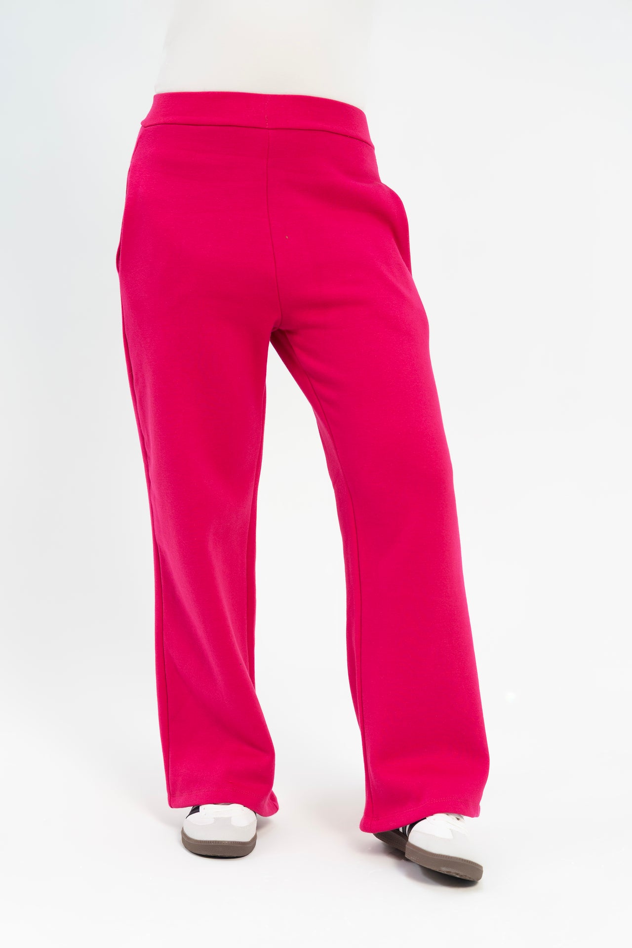 Experience comfort and style with our Wide Leg Fleece Sweatpant in vibrant Fuchsia Pink. Crafted from soft fleece fabric, it features a ribbed waistband for a secure fit, convenient side pockets, and back patch pockets for practical storage. The straight wide leg design offers a relaxed silhouette, perfect for both lounging and casual outings.
