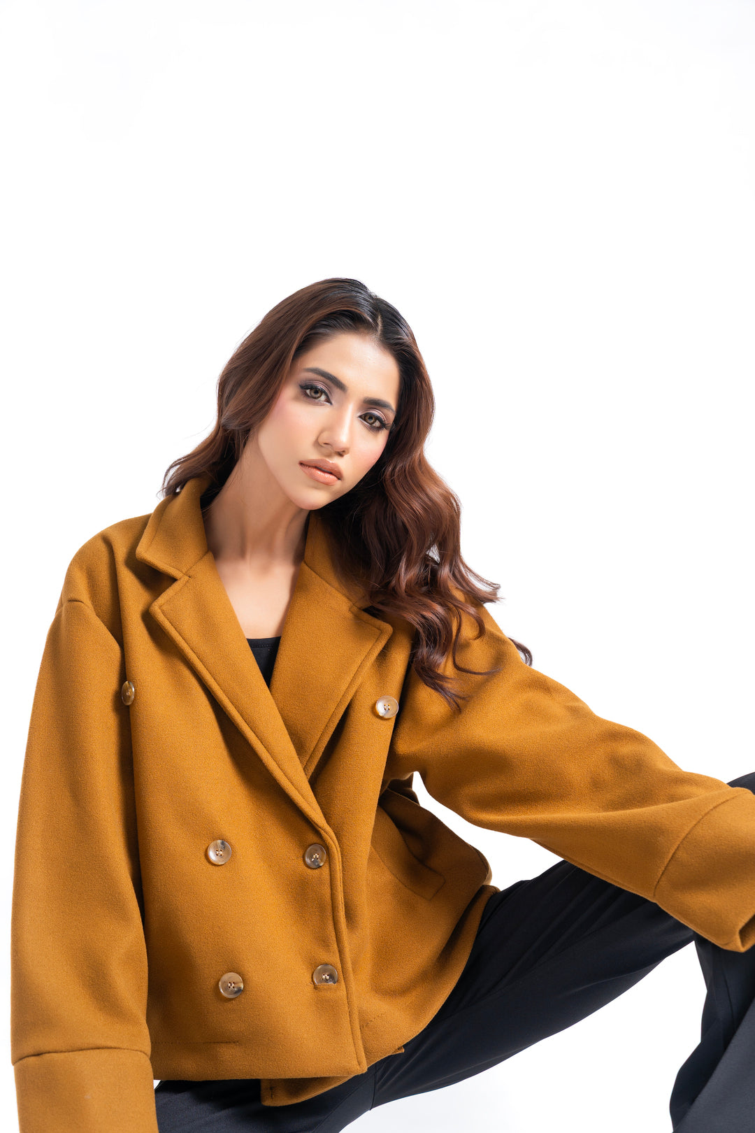 Double Breasted Wool Jacket in a versatile tan shade, featuring full sleeves and a refined lapel collar. The double-breasted front adds structure and sophistication, while quality wool construction ensures durability and warmth. Perfect for layering or wearing as a standalone piece for polished, professional styling.