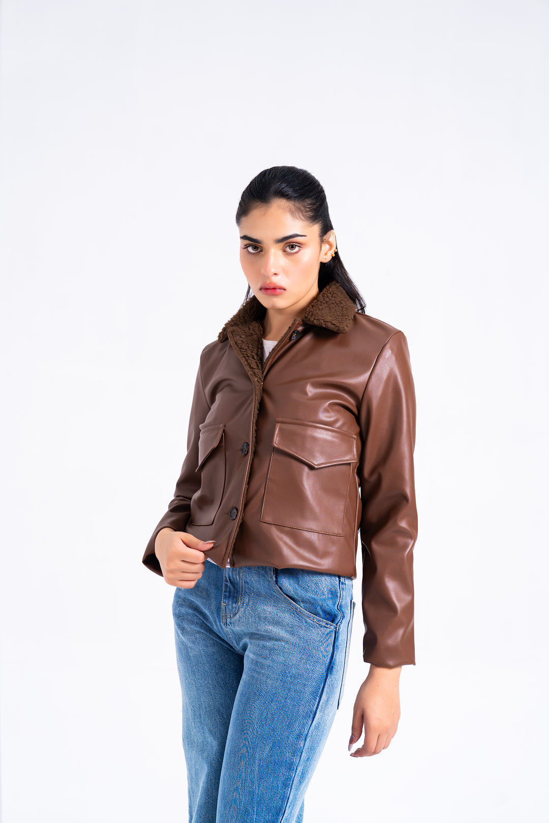 Sherpa Collared Leather Jacket with Patch Pocket - Brown