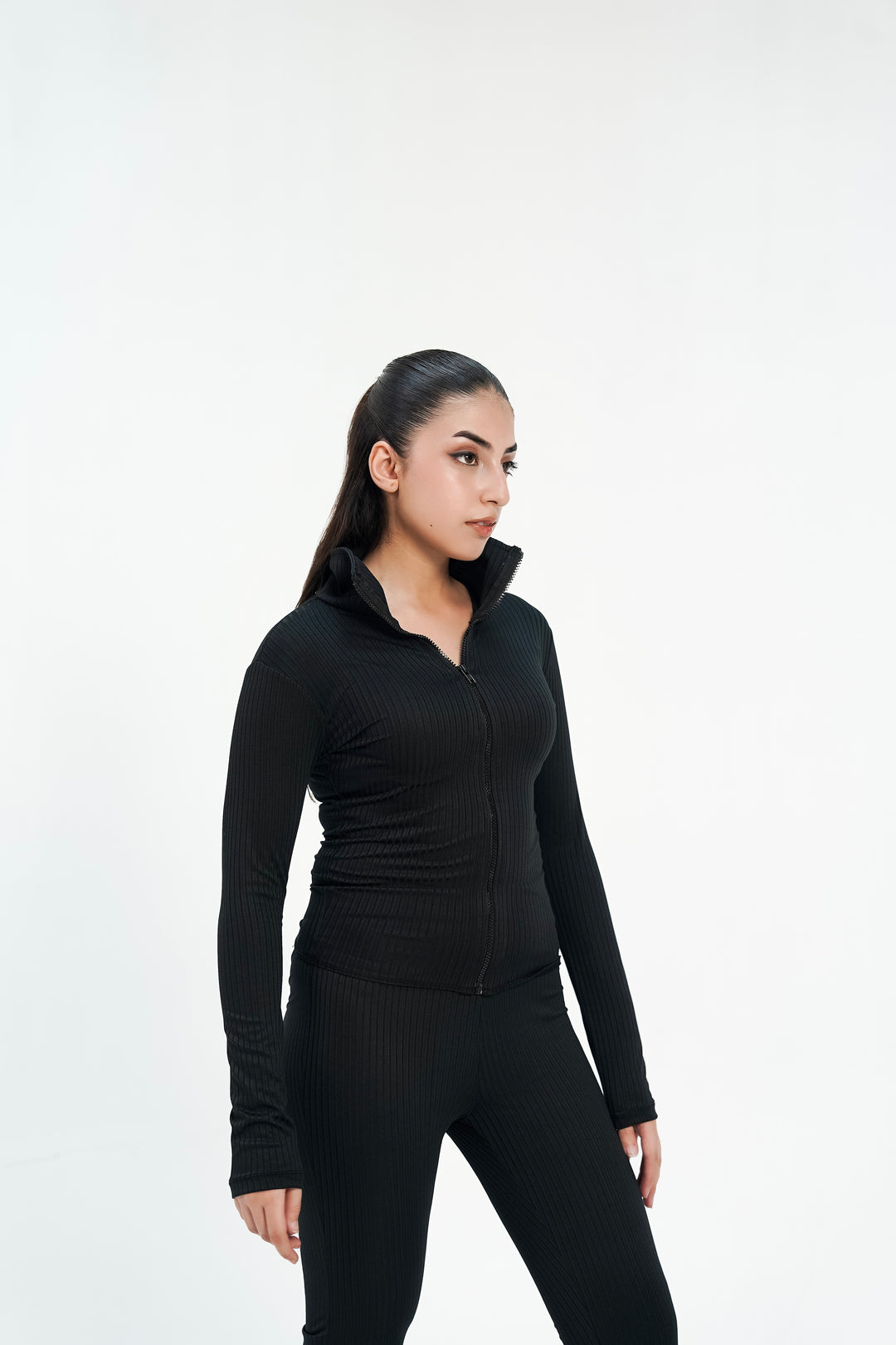 This black activewear jacket features a high collar and front zip closure for secure fit and easy layering. Made from polyester rib fabric, it offers durability and flexibility, while the full sleeves and fitted design ensure comfort and a sleek silhouette during workouts or casual wear.