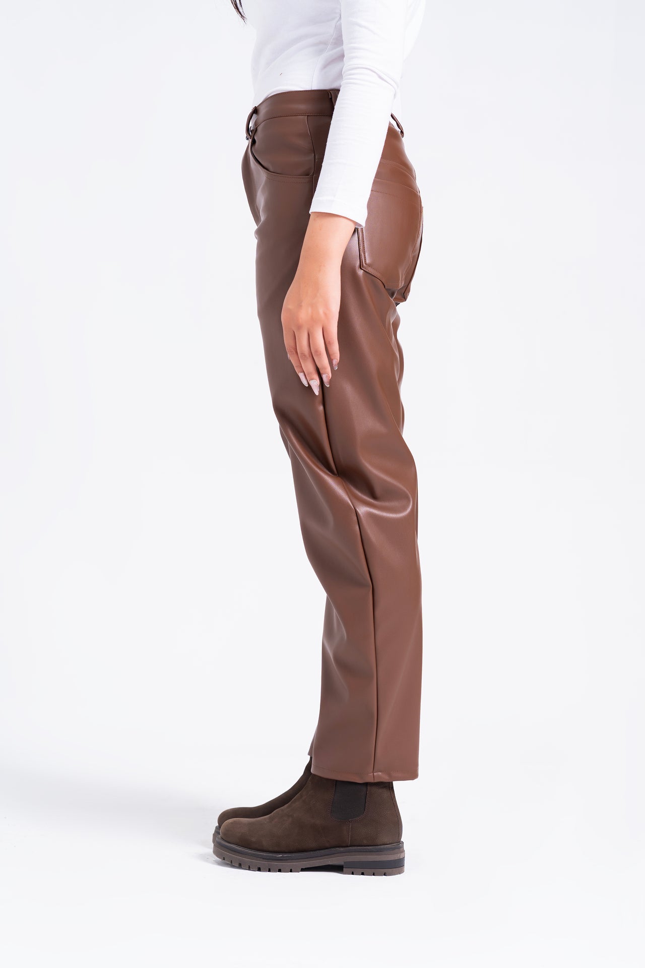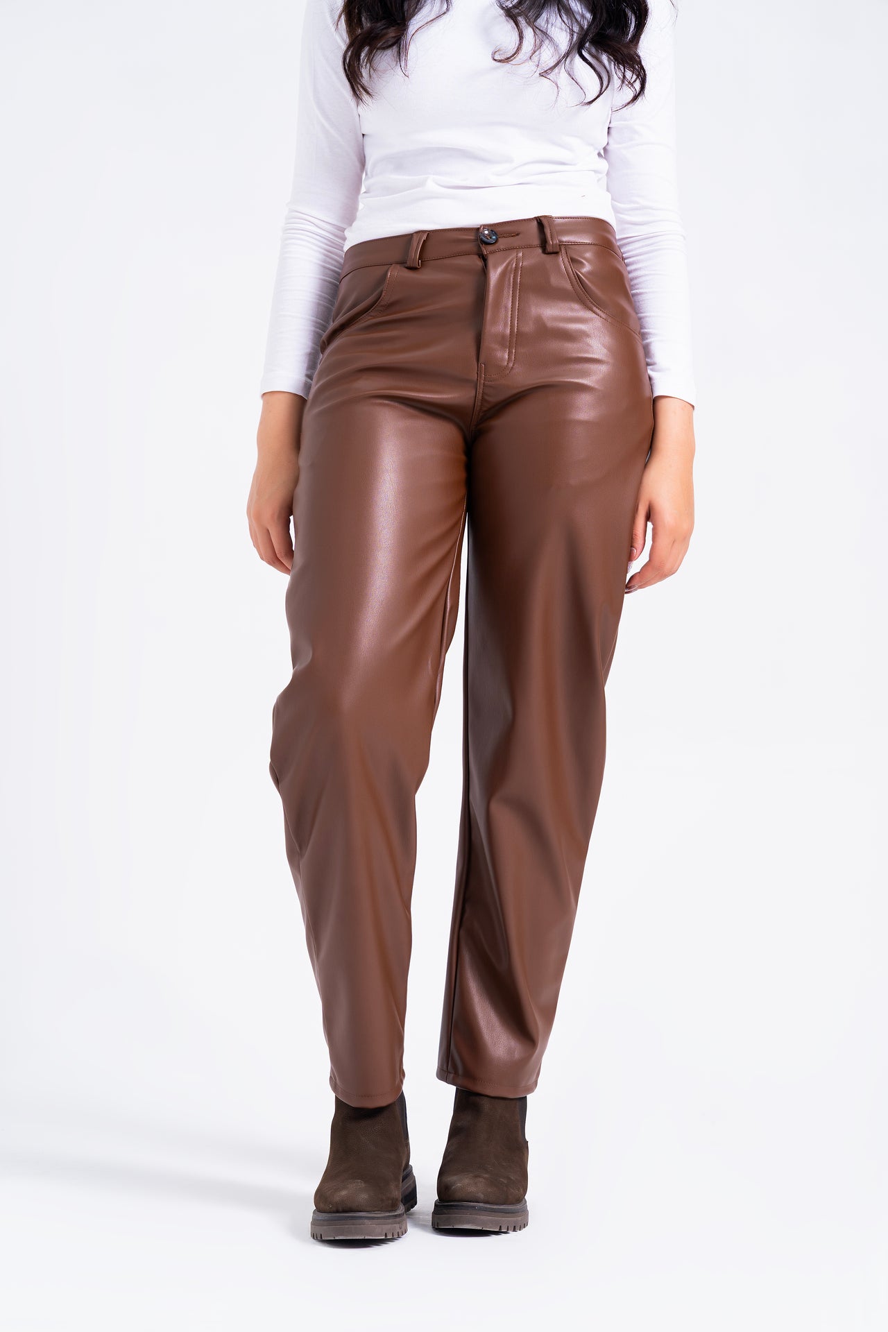 The Barrel Leg Pant in brown faux leather delivers a contemporary edge with its distinctive barrel silhouette and mid-rise construction. This versatile piece balances modern aesthetics with practical functionality scoop pockets and back patch pockets keep essentials within reach, while the front button closure provides a secure, polished fit.