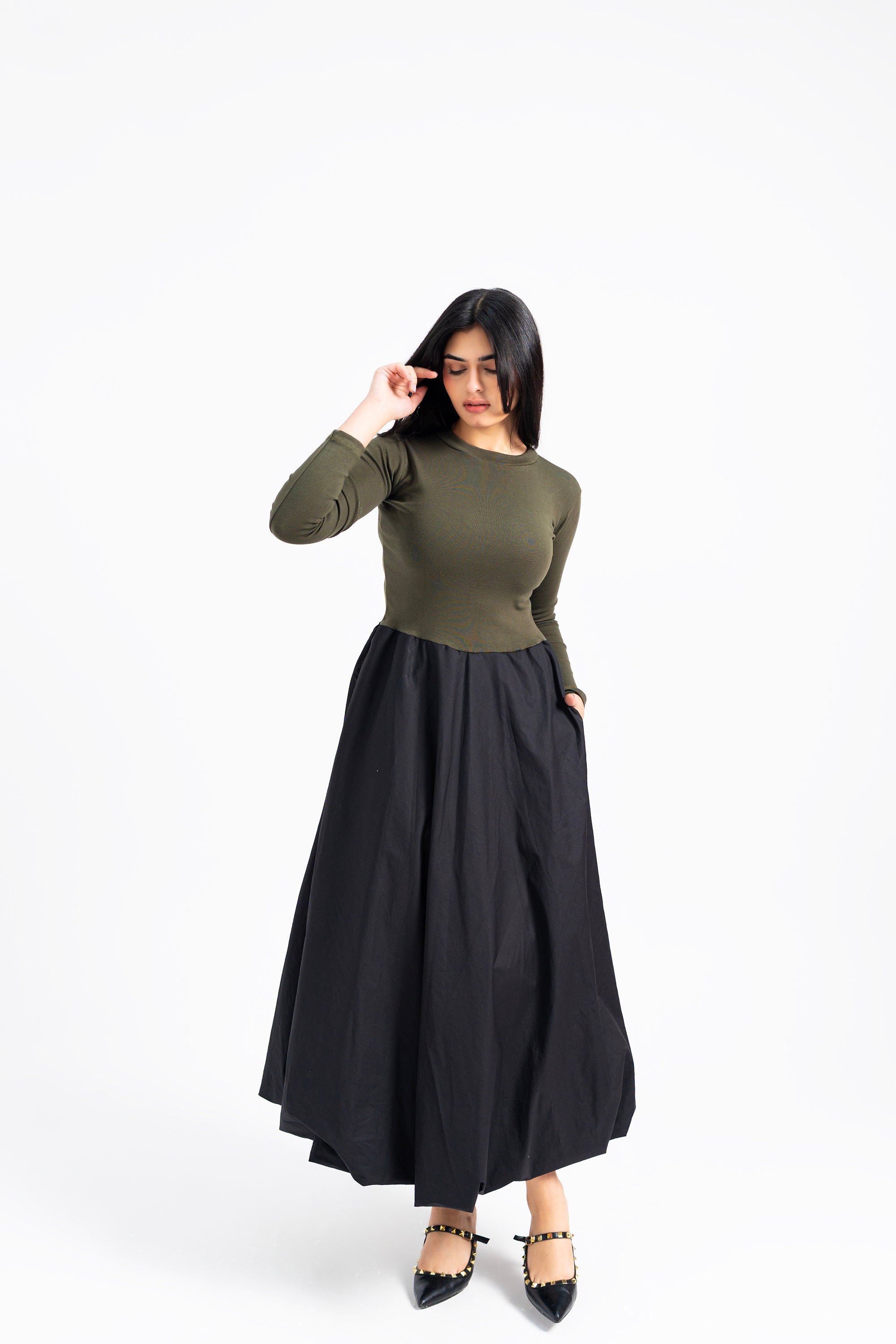 Designed for everyday comfort with a modern edge, this ribbed bubble hem dress features a fitted bodice paired with a sculpted skirt for a flattering silhouette. The full sleeves and round neckline offer balanced coverage, while the green and black color-block design adds a fresh yet wearable contrast. Easy to style and comfortable to wear, this dress works well for daily wear and casual outings.