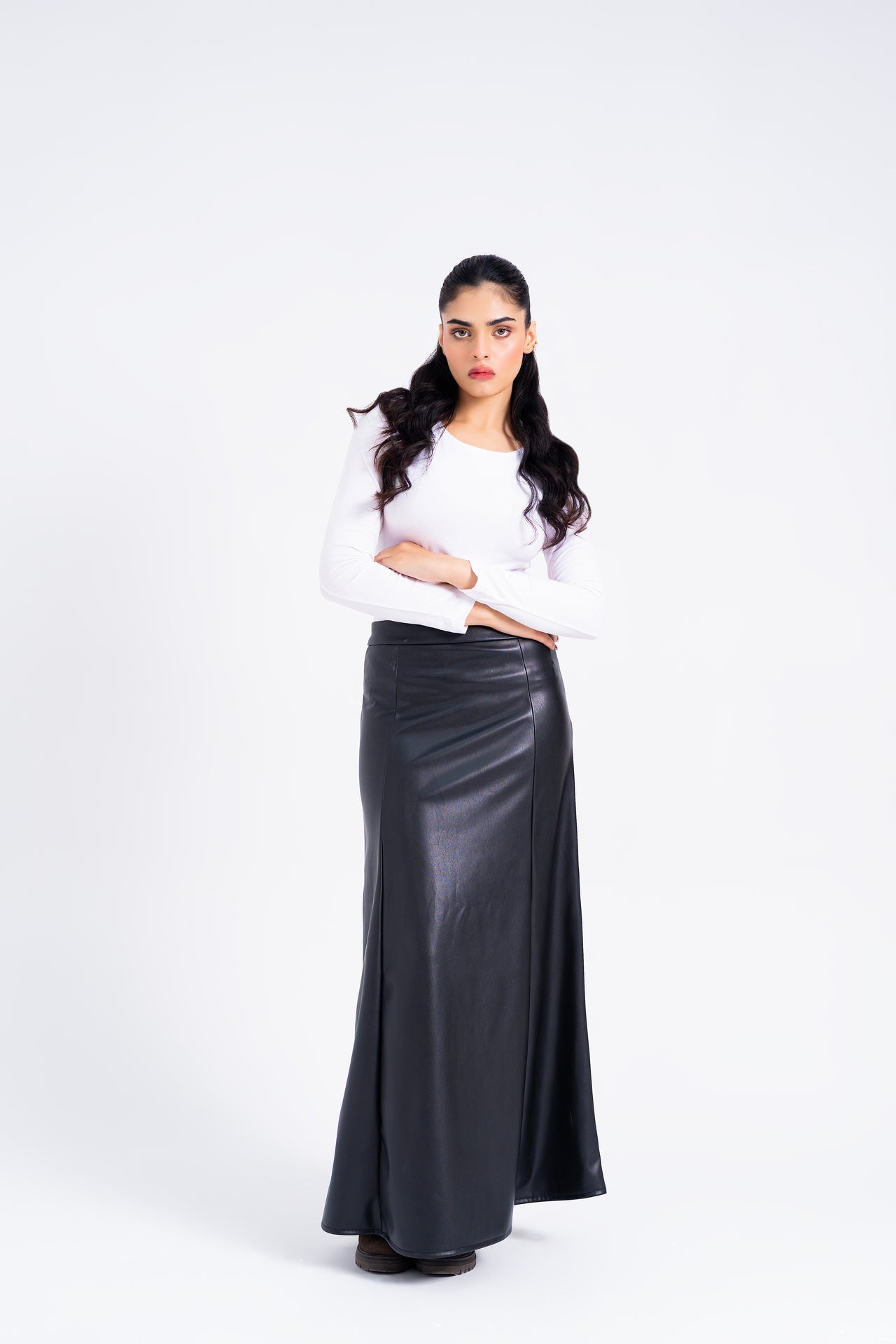 Expertly tailored in luxurious leather, this black A-line skirt delivers sophisticated style with functional sophistication. The structured fixed waistband provides dependable support and stability, while the strategically positioned side zip streamlines the silhouette for a polished appearance.