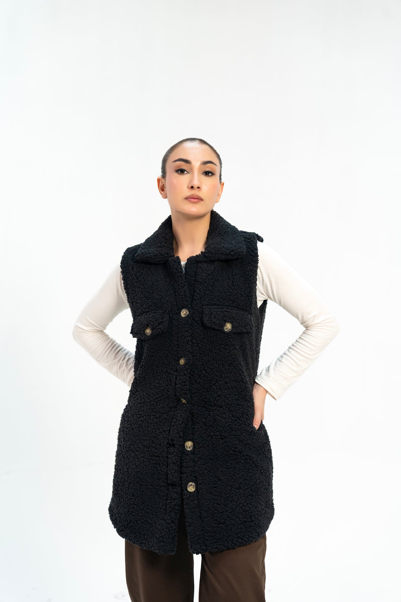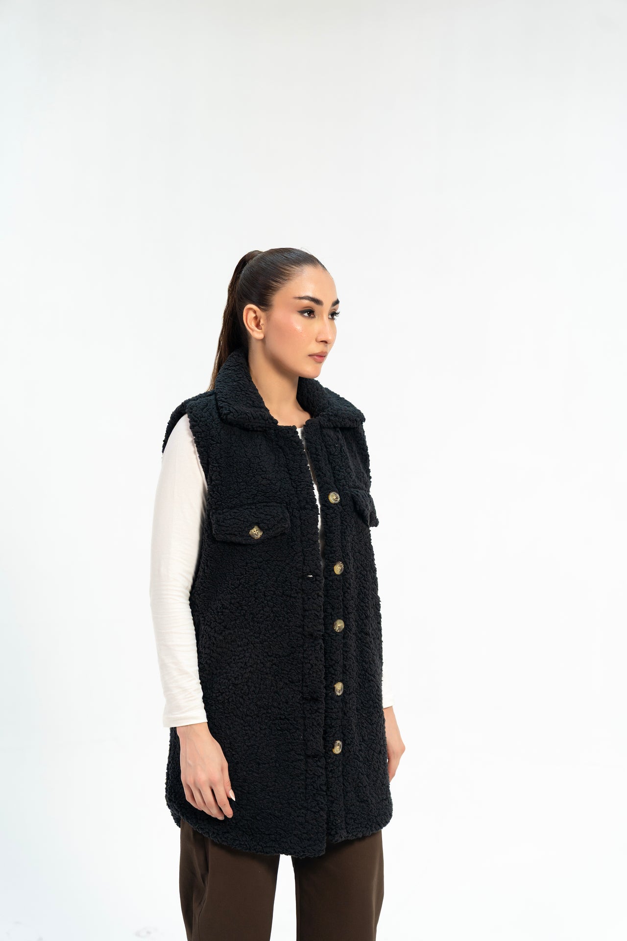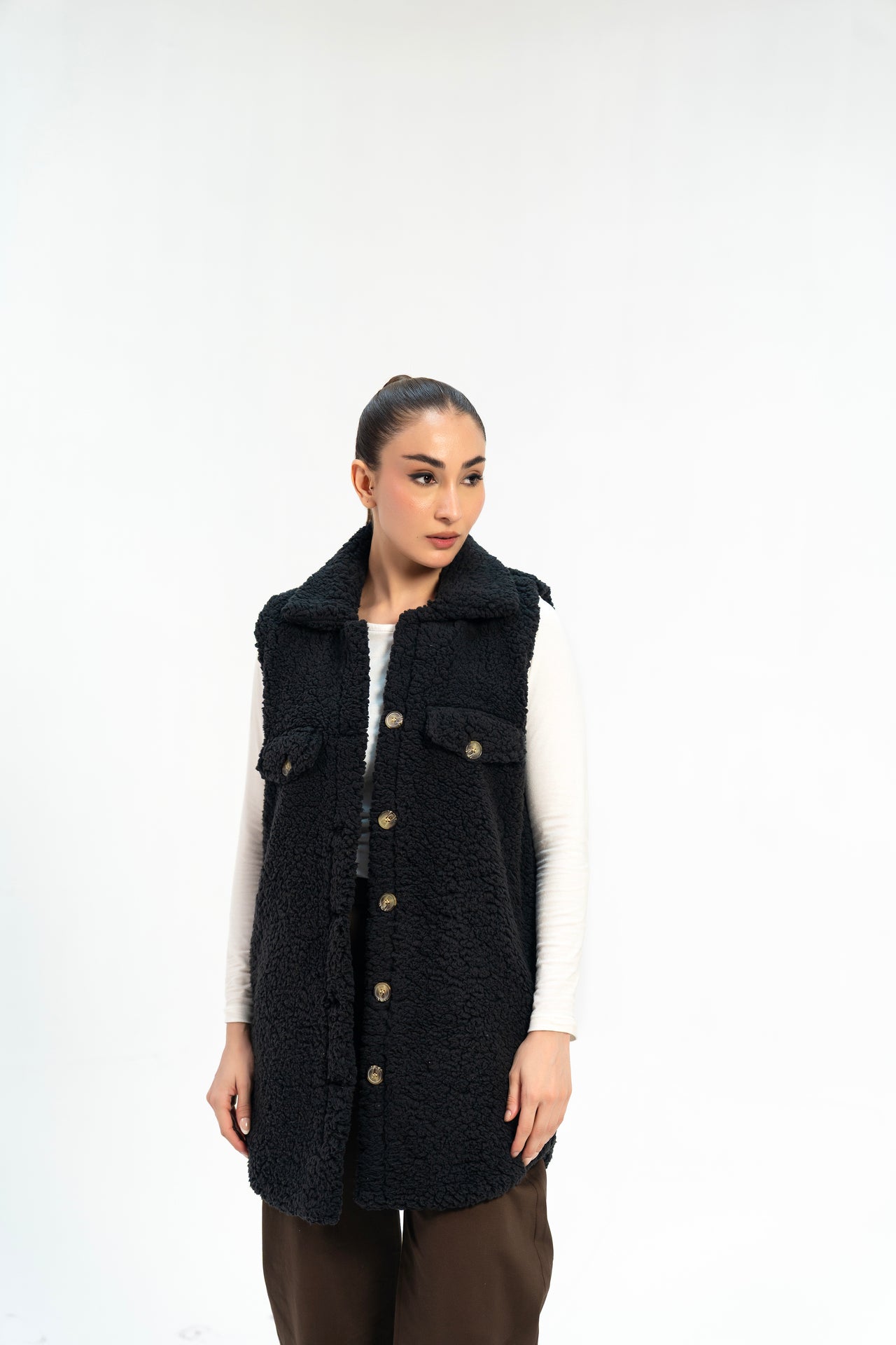 This black Sherpa long vest features a collared neckline and front button closure with stylish fake flaps, designed for a sleek, sleeveless look. Crafted from 100% polyester sherpa with a quilted lining, it offers comfortable insulation while maintaining a regular, true-to-size fit. Ideal for layering, this vest blends warmth and style effortlessly for versatile wear.