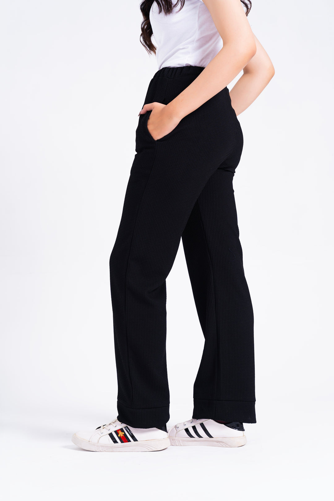 Wide Leg Pants in Waffle - Black Elevate your everyday wardrobe with these expertly tailored wide-leg pants, constructed from premium waffle-textured fabric that combines visual interest with refined comfort. The elasticated waistband provides a secure, adjustable fit ideal for extended wear.