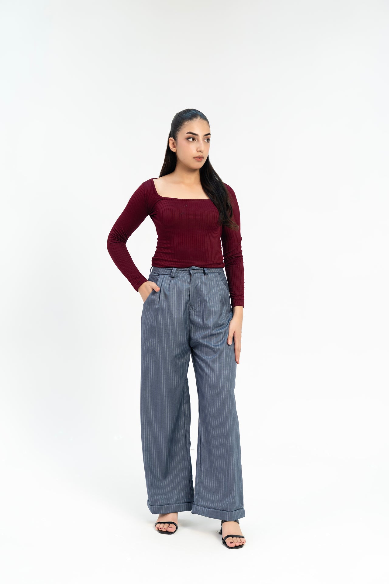 These wide leg pants in grey white pinstripe offer a high-rise silhouette with front pleats that enhance their tailored look. Made from breathable tropical suiting fabric, they provide comfort and a smooth drape throughout the day. Designed with cross pockets and a hook and bar closure, they combine functionality with a polished finish. The turnup hem adds a subtle, refined detail, perfect for elevating your professional or smart-casual wardrobe.