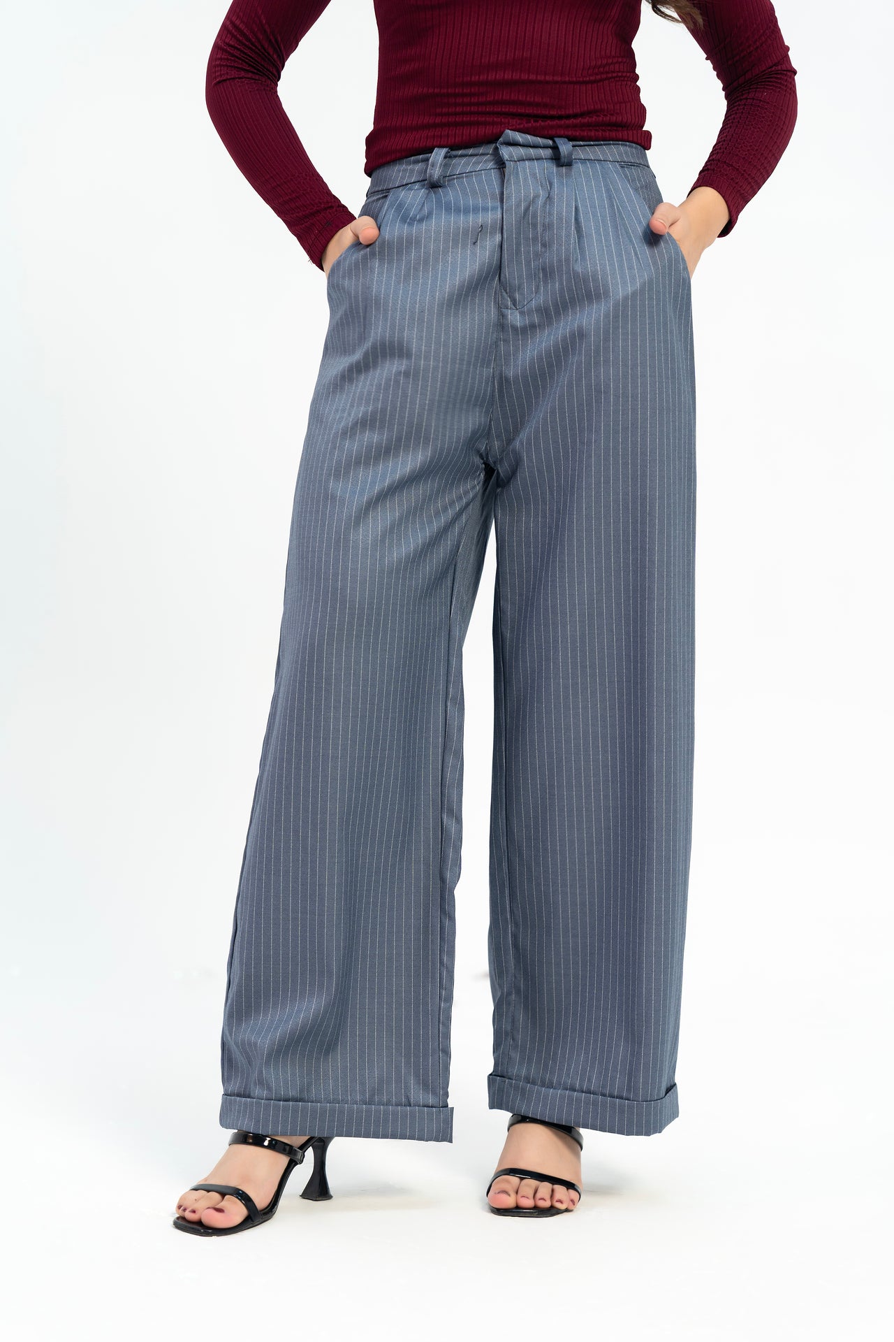 Wide Leg Pleated Pants with Turnup - Grey White Pinstripe
