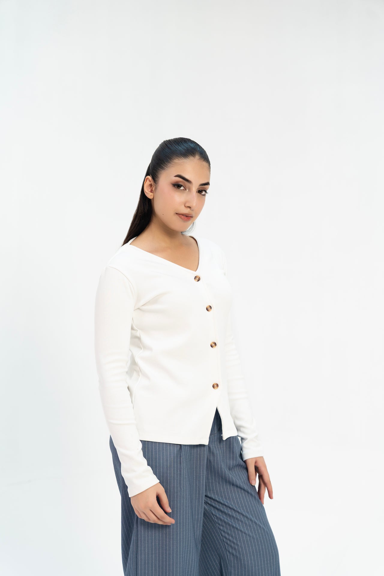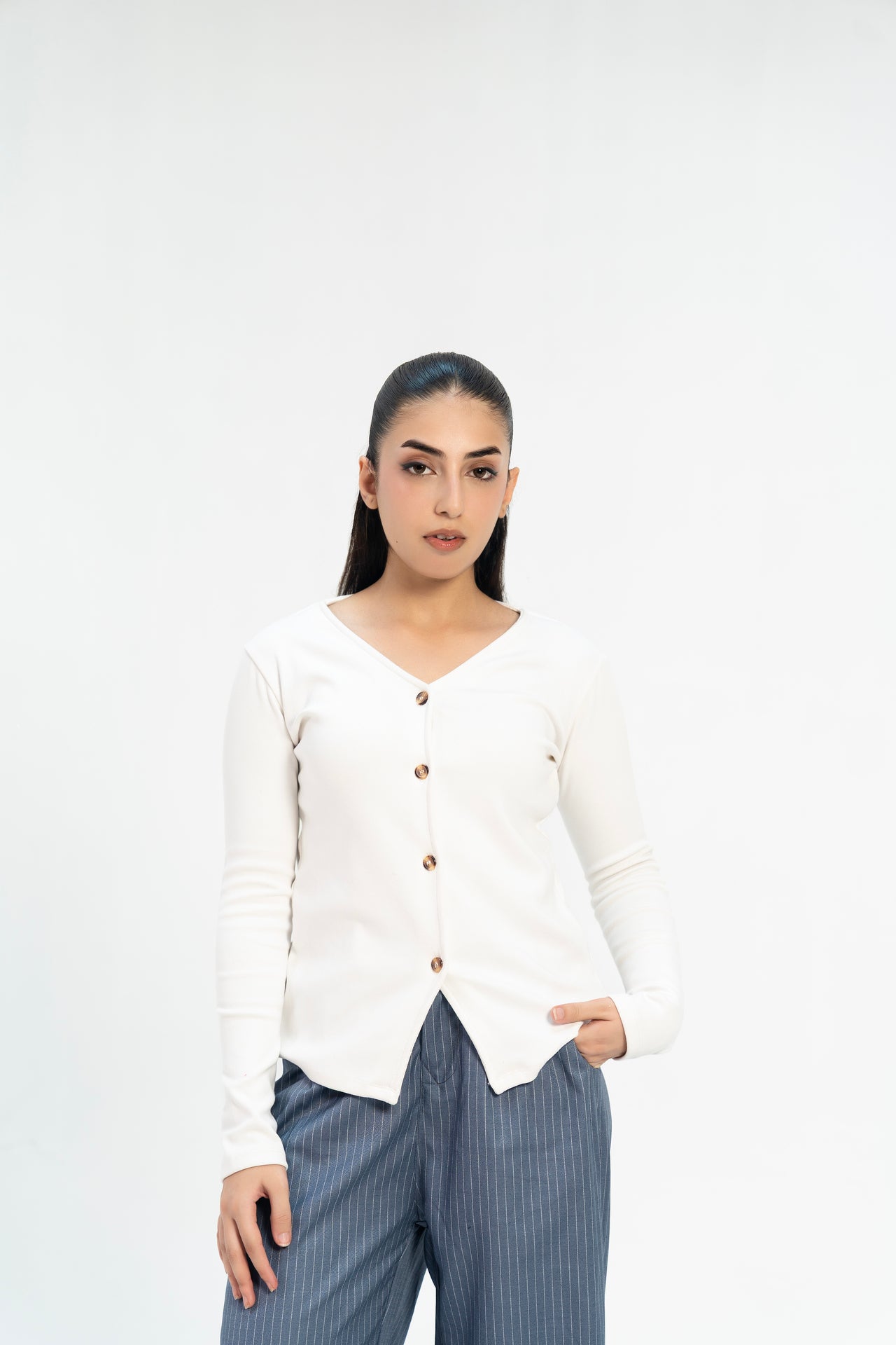 The Ribbed V Neck Top in white features a classic V neckline and a front button opening, combining style with practicality. Crafted from ribbed knit fabric, it offers a slim, true-to-size fit that contours the body comfortably. Full sleeves add a polished touch, making this top ideal for layering or wearing on its own in both casual and professional settings.