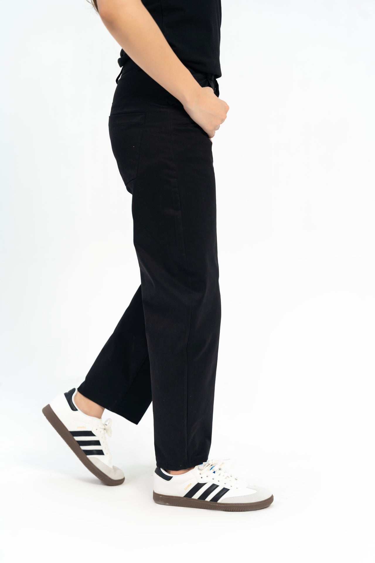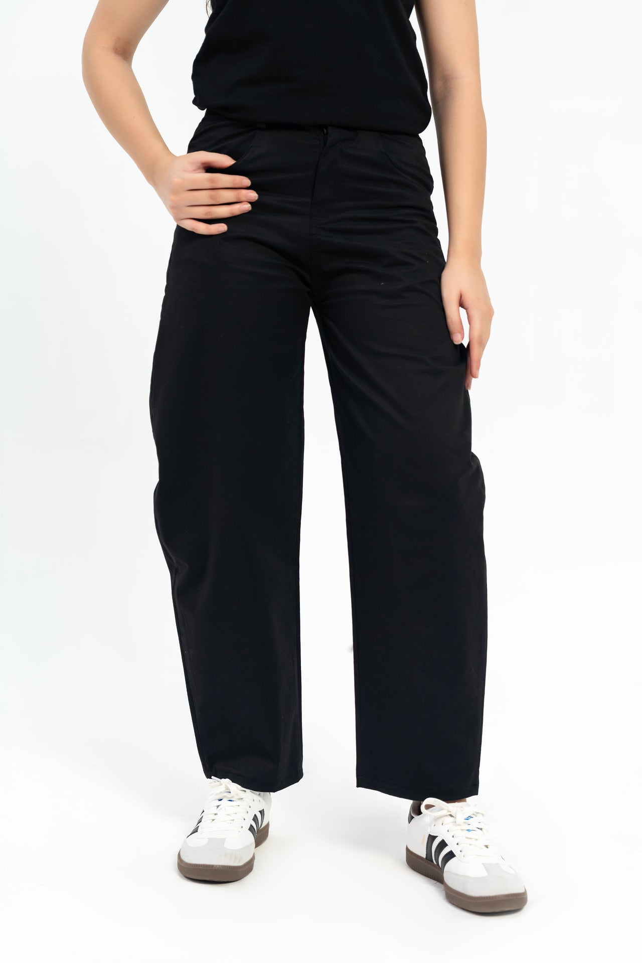These Black Barrel Leg Pants offer a mid-rise silhouette with a comfortable fit, crafted from sturdy cotton twill for lasting wear. Featuring scoop pockets, a front button closure, and practical back patch pockets, they combine functional design with a sleek, versatile style suitable for various occasions.