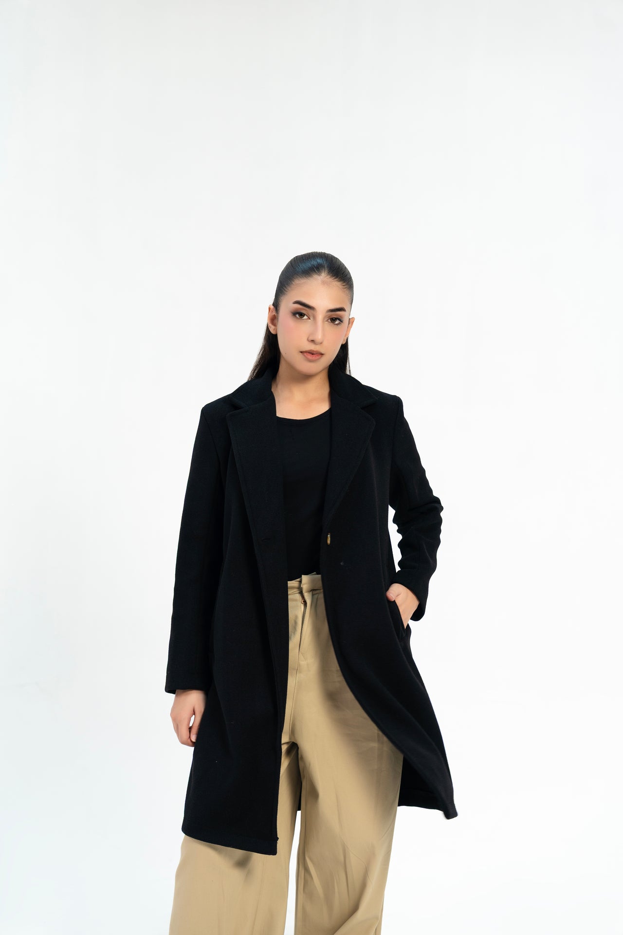 Effortlessly elevate your wardrobe with our Classic One-Button Wool Coat. Featuring a single button closure, side welted pockets, and a lapel collar, this coat exudes timeless sophistication. The long sleeve design and lining provide both warmth and style. A must-have for any fashion-forward individual.