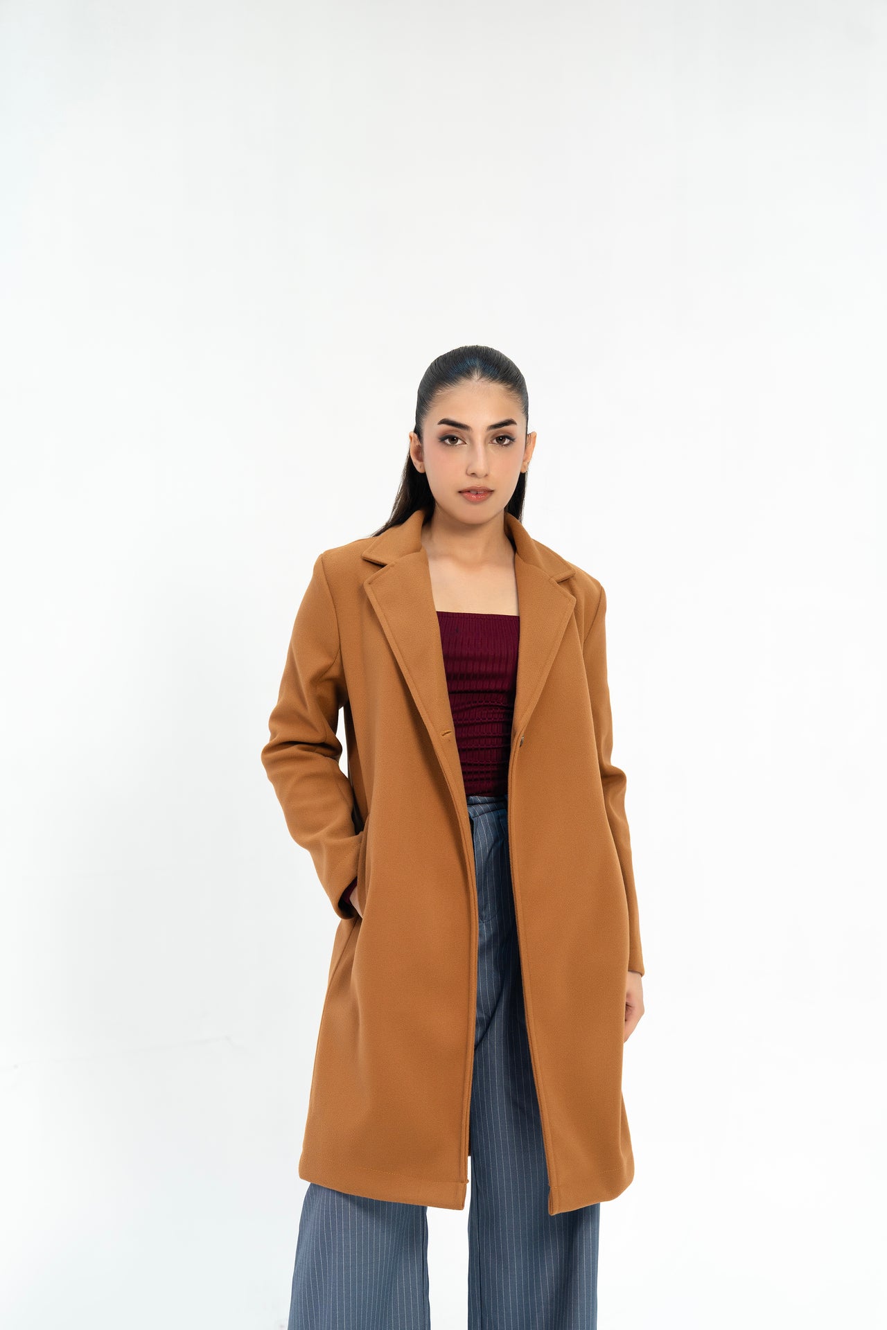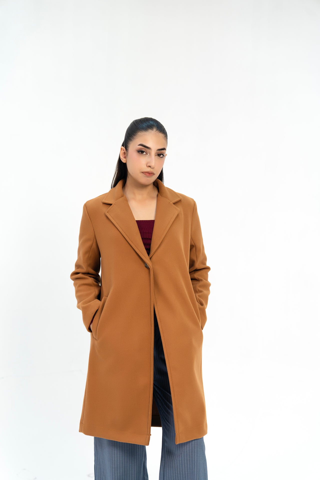 This classic camel wool coat features a sleek single-button closure and side welted pockets for a refined silhouette. Designed with long sleeves and a lapel collar, it delivers timeless elegance and warmth, perfect for sophisticated layering in cooler weather.