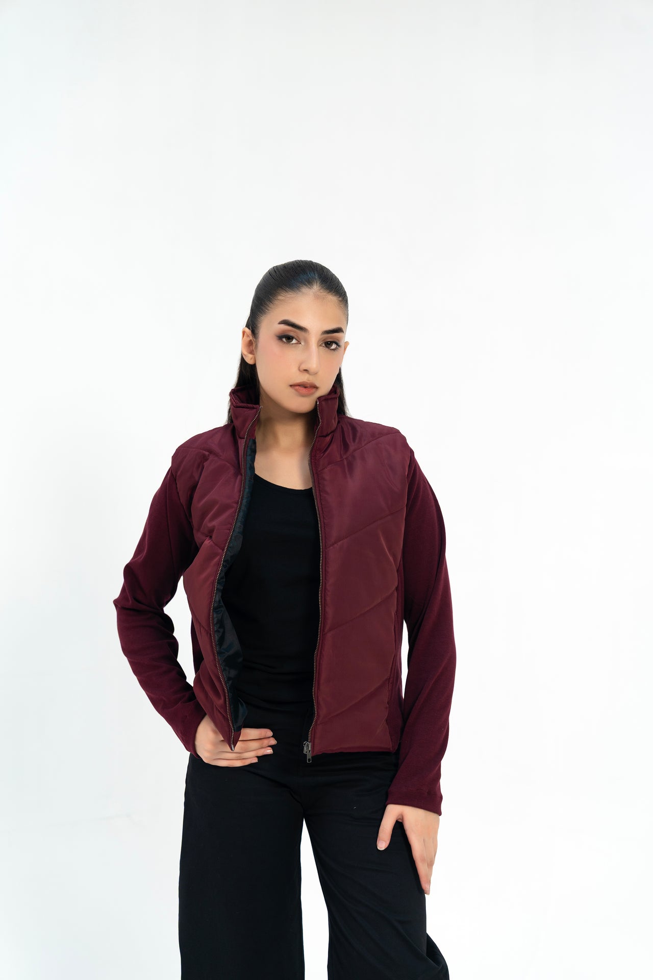 This contrast puffer jacket in maroon combines practical design with stylish details. Featuring a high neck and long sleeves, it provides warmth and comfort, while side pockets and a zip front fastening add functionality. The regular fit ensures easy movement, and the ribbed knit contrast panels and sleeves enhance its texture and visual appeal. Made from 100% polyester for the outer shell, lining, and wadding, with ribbed knit fabric on contrast sections, it offers durability and effective insulation for cooler weather. A versatile choice for both performance and style.