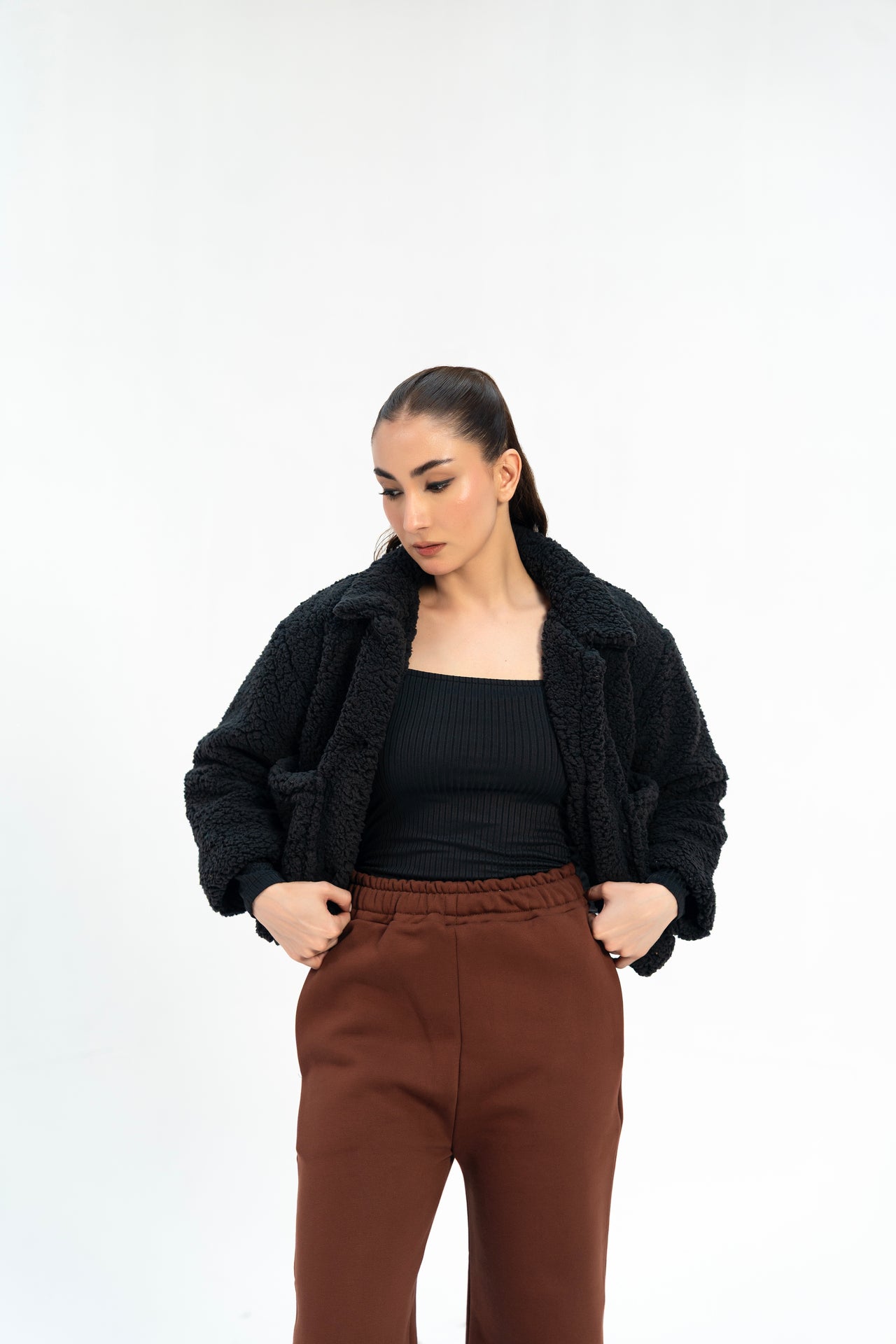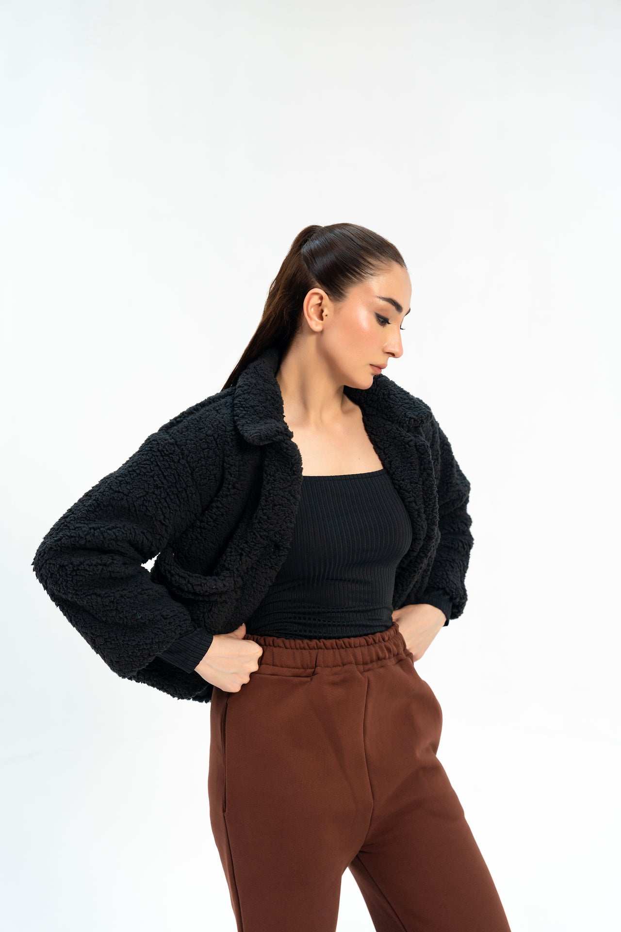 This black cropped sherpa jacket features a tailored collar and front button closure for a polished look. Designed with full sleeves and practical patch pockets, it combines style with functionality. An ideal layering piece for cooler days, it offers warmth without bulk, making it a versatile addition to any wardrobe.