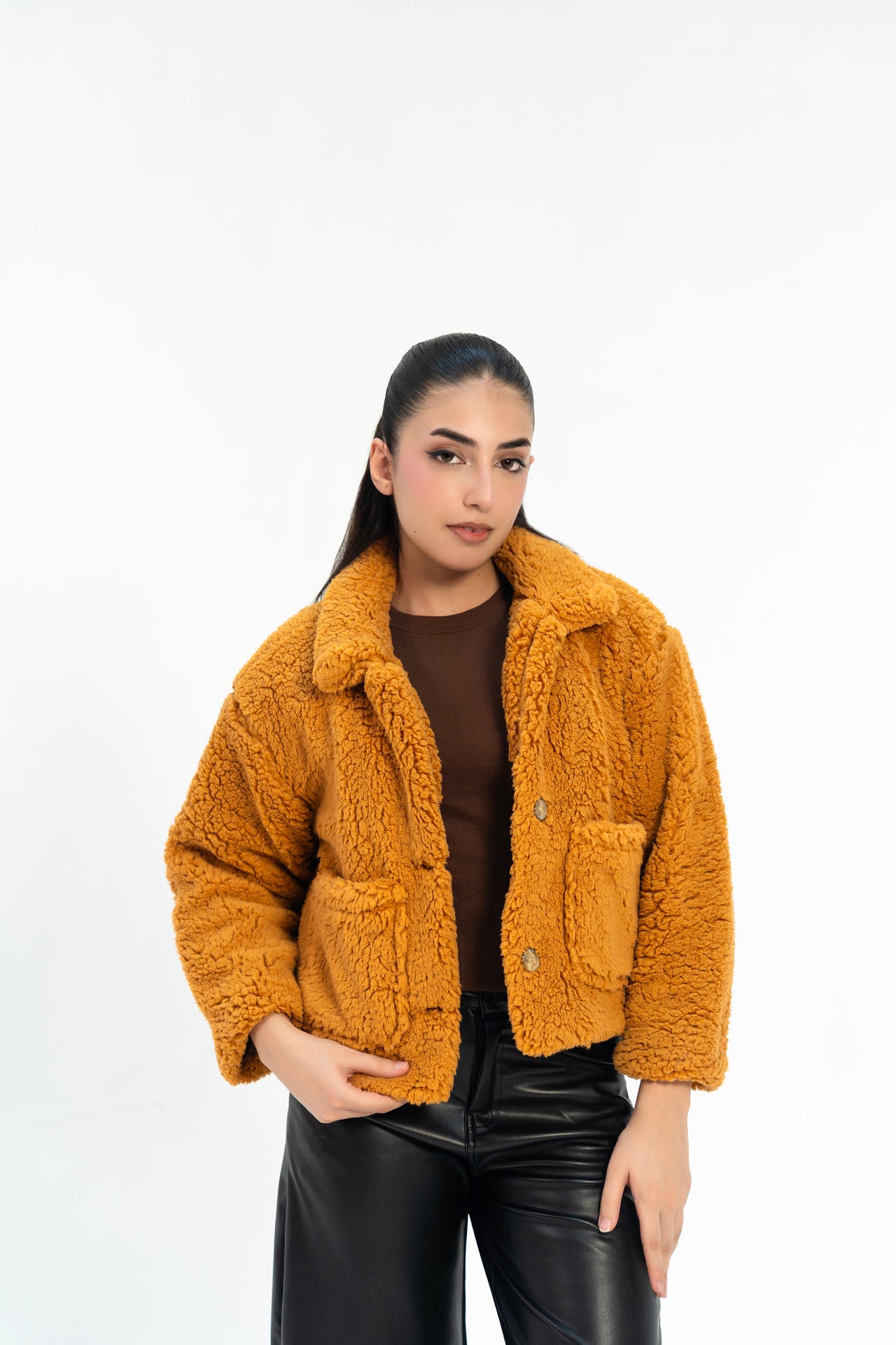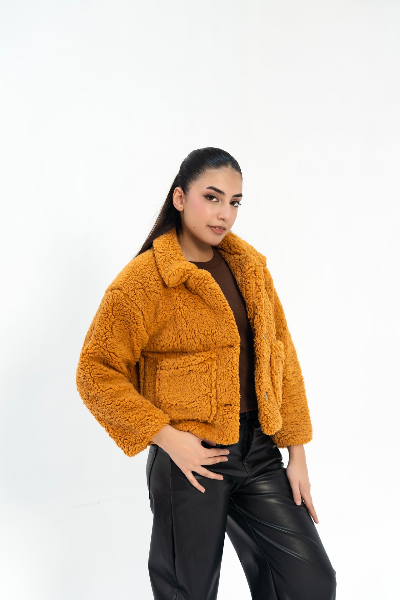 This camel cropped sherpa jacket combines a refined collar and front button closure for a sleek silhouette. Featuring full sleeves and convenient patch pockets, it balances practicality with style. Perfect for layering on chilly days, it provides warmth while maintaining a lightweight feel, making it a versatile and stylish addition to your wardrobe.