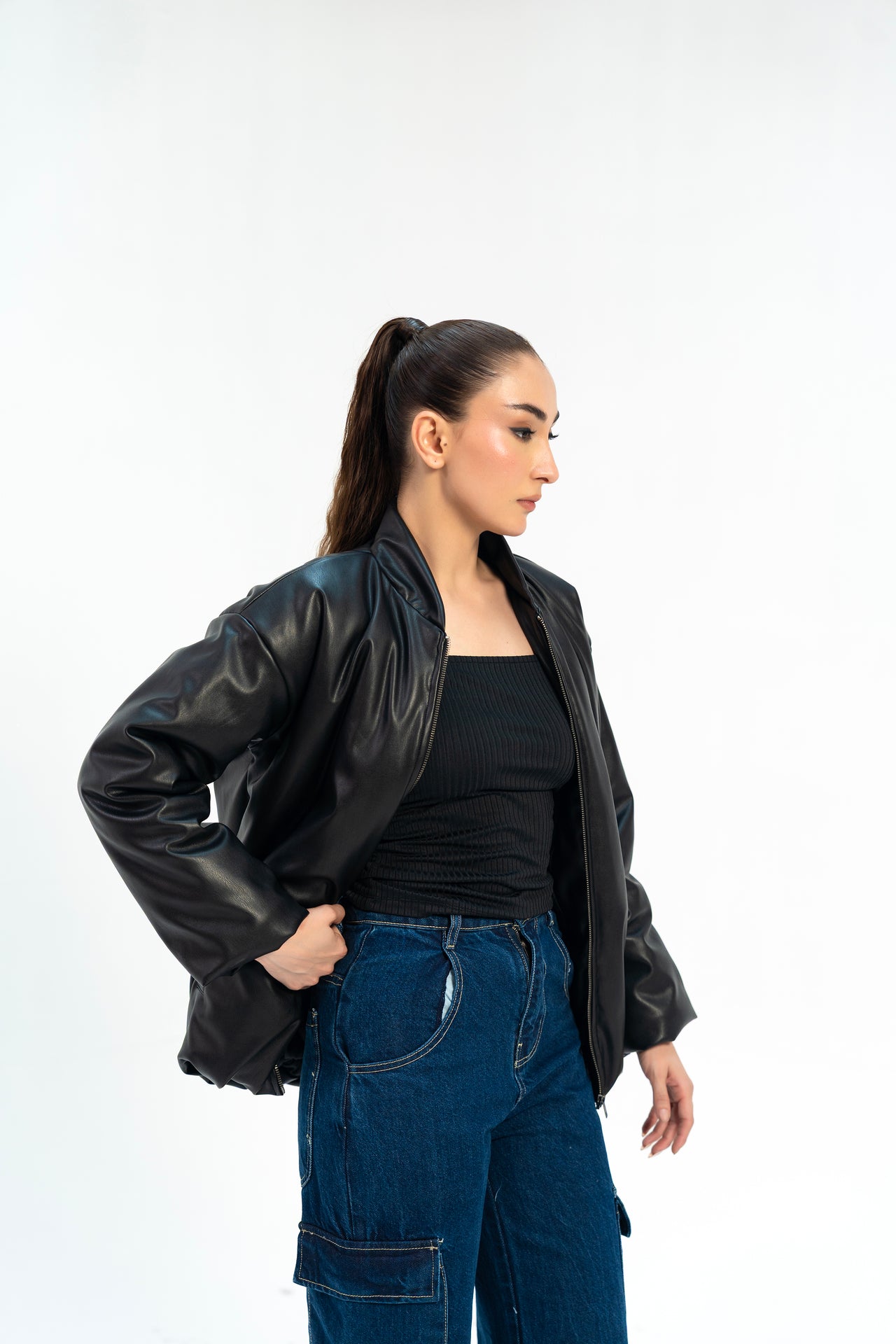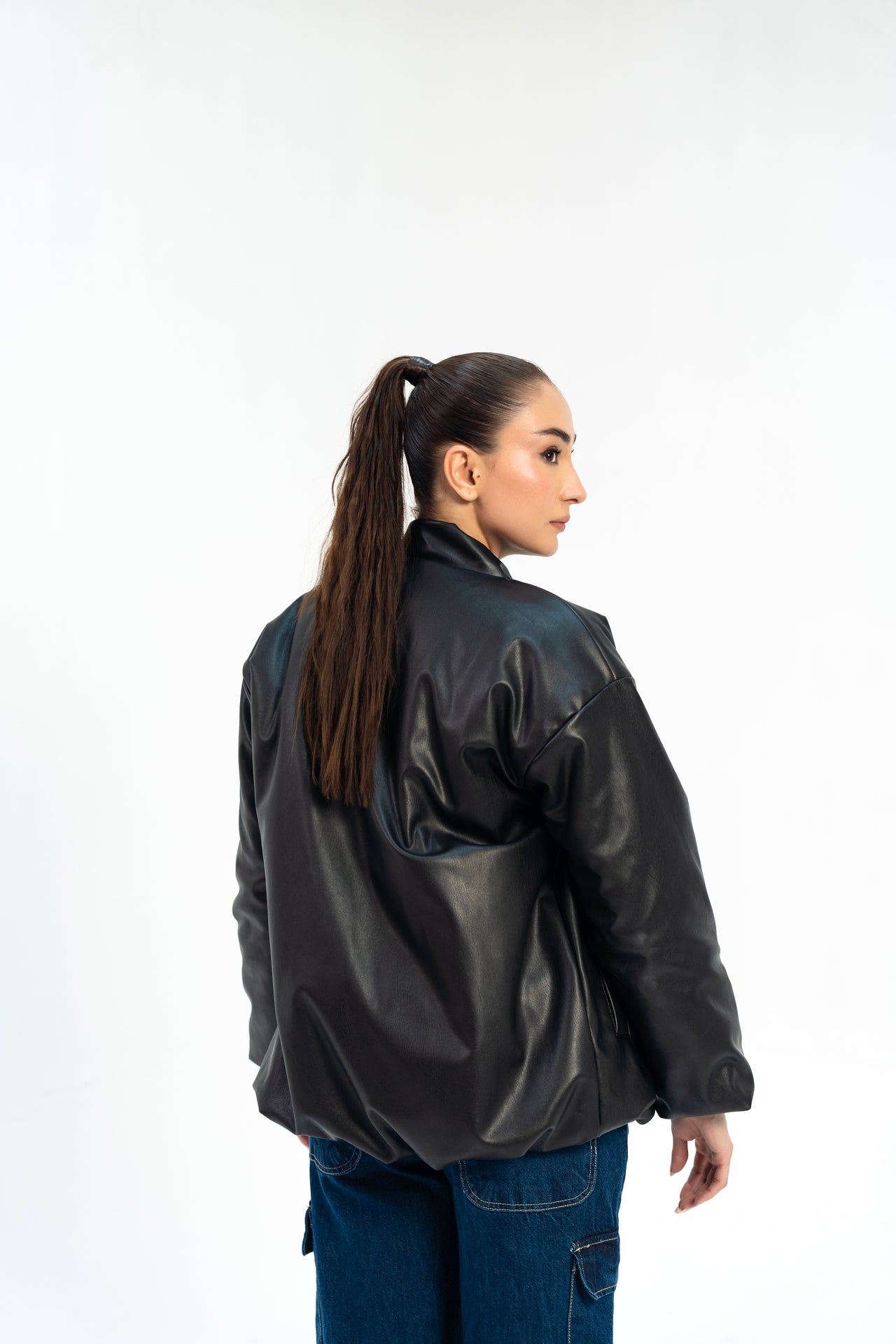 This black faux leather puff jacket features a structured design with side pockets for convenience. The zip front fastening ensures secure closure, complemented by an elasticated cuff and hem for a snug fit. Its padded construction offers warmth and a comfortable oversized silhouette, blending style with practicality for cooler days.