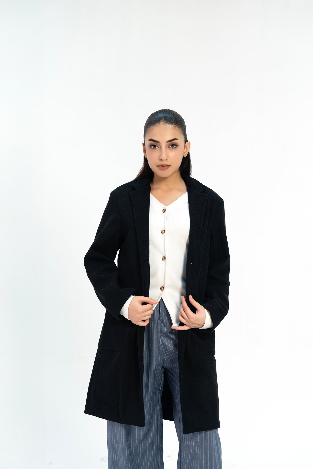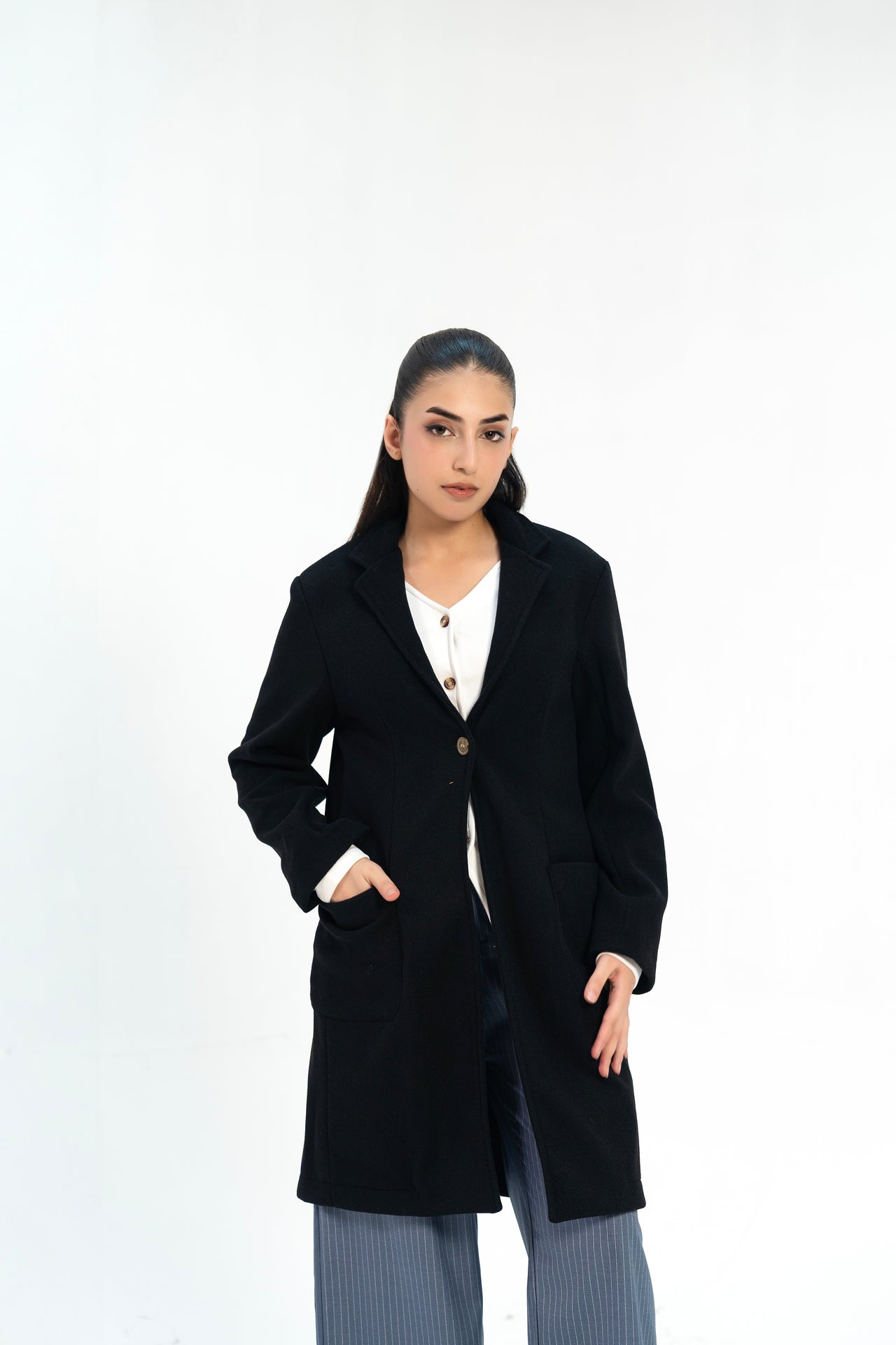 This classic black long coat features practical patch pockets and a single button front closure for a streamlined look. Designed with a back slit for ease of movement and long sleeves for added coverage, it combines style with functionality for a polished, professional appearance.