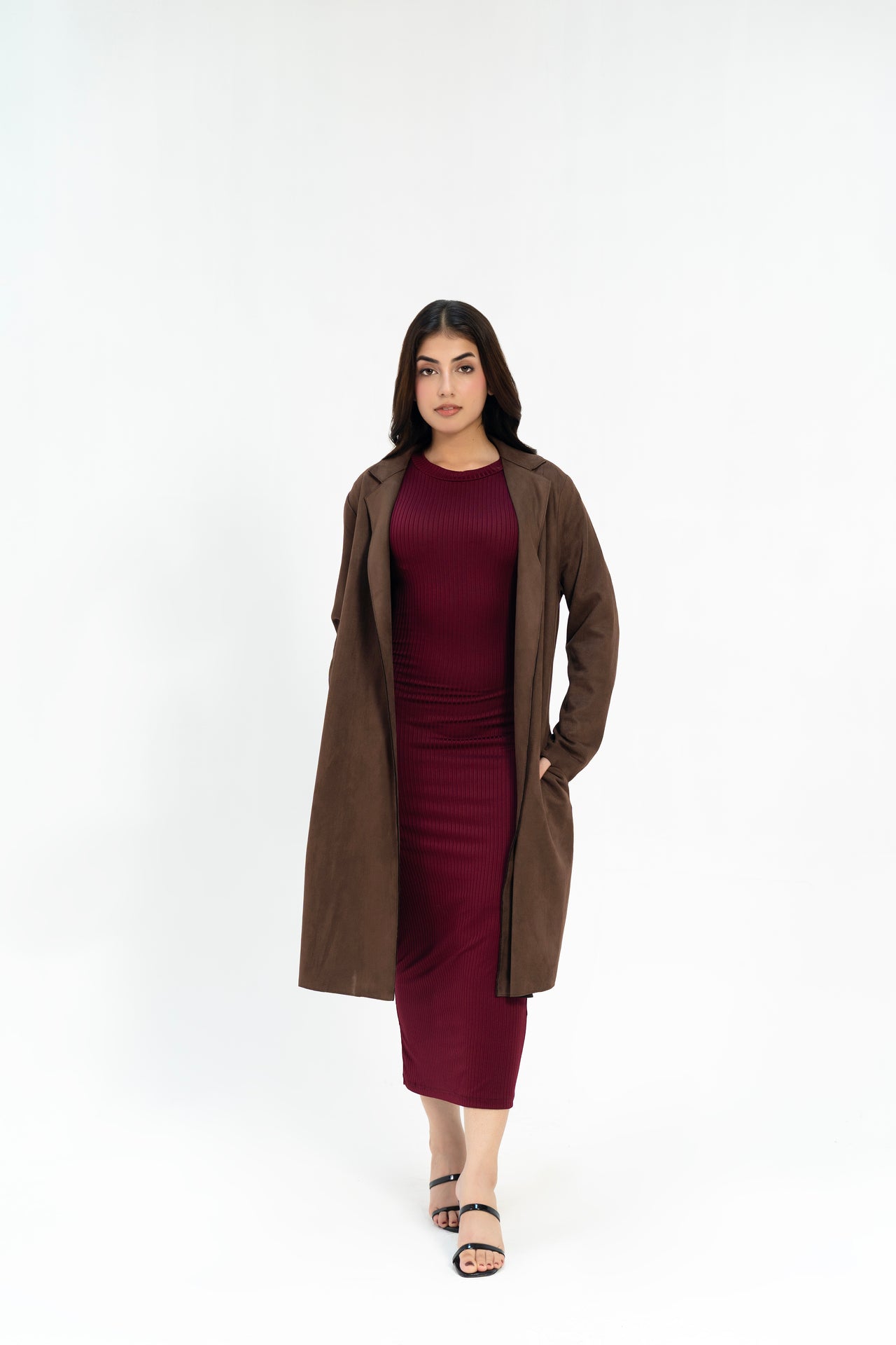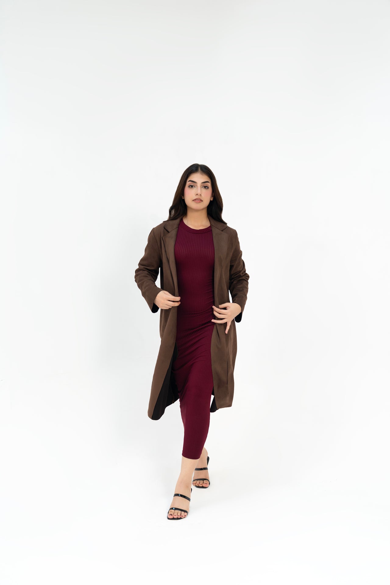 This chocolate brown suede coat features an open front design and a classic lapel, combining sophistication with easy layering. Its long sleeves provide warmth, while side pockets offer practical storage for essentials. Perfect for adding a refined touch to your wardrobe with both style and function.