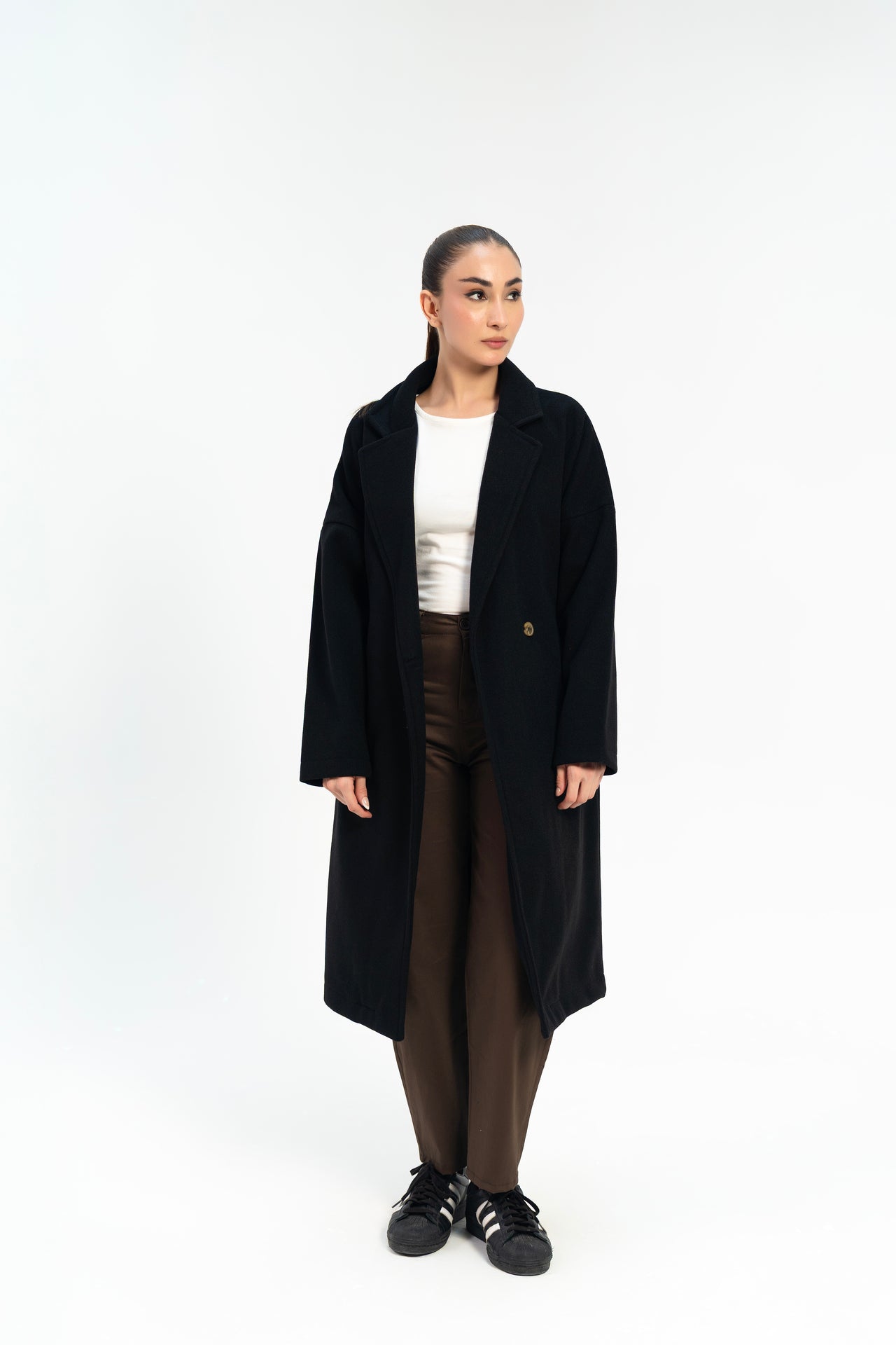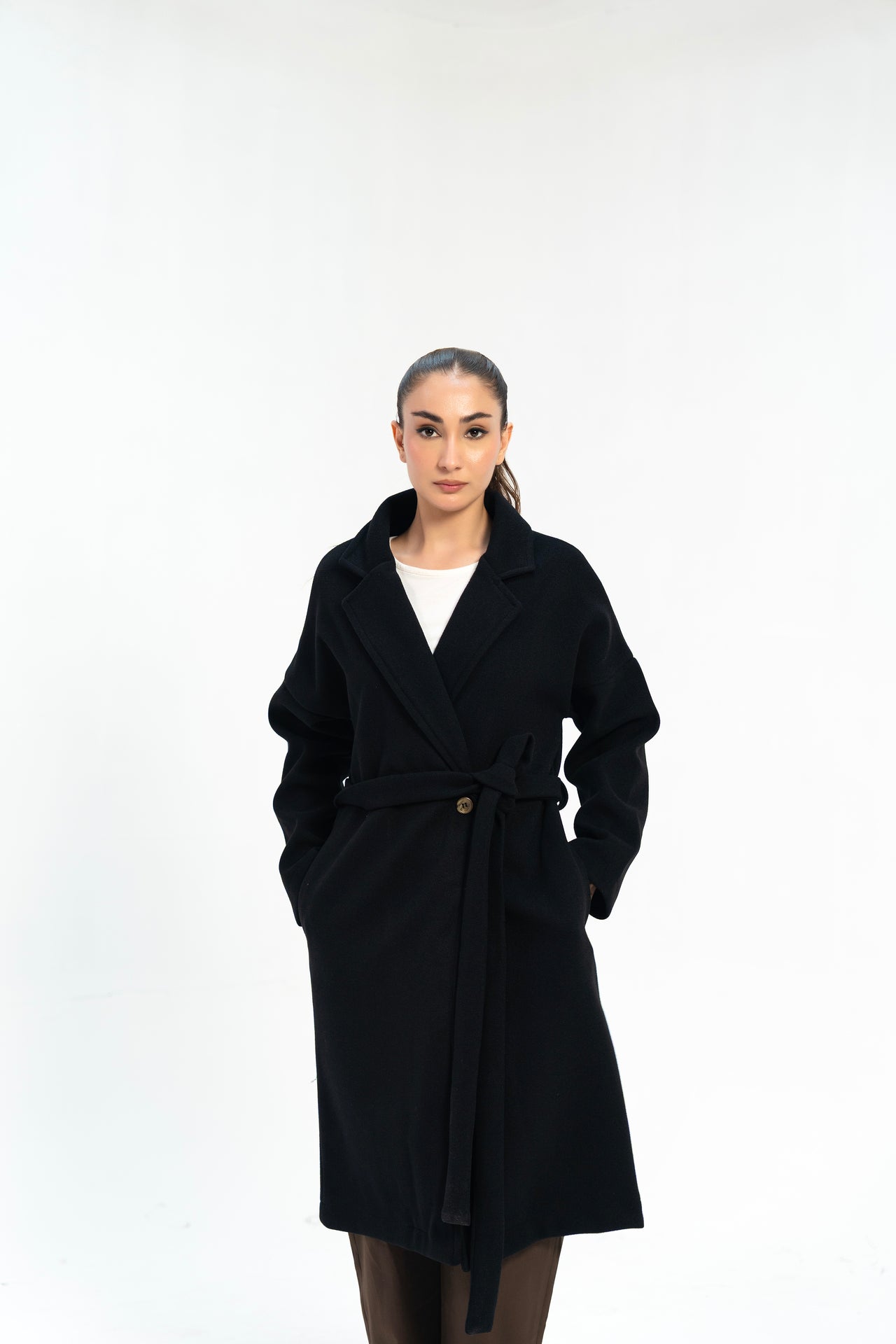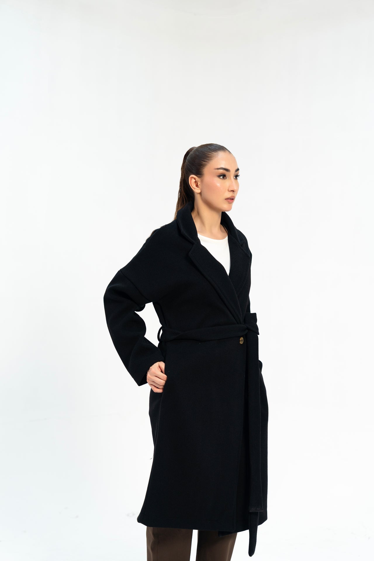 This oversized wool coat in black features a double-breasted front and a removable belt for versatile styling. Designed with full sleeves, side pockets, and a lapel collar, it offers both functionality and sophistication. Fully lined for added comfort and durability.