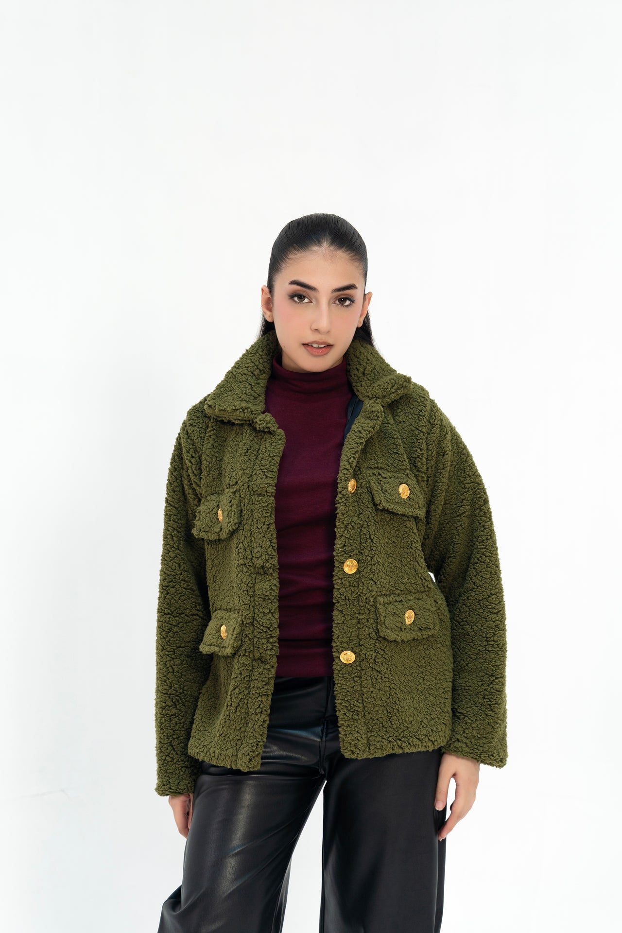 This Sherpa jacket in olive offers an oversized silhouette crafted from 100% polyester with a smooth lining for comfort. Featuring a collared neckline, front button closure with metal buttons, and stylish fake flaps, it blends functional design with contemporary style. Full sleeves provide added warmth, while the relaxed fit allows layering versatility consider sizing down for a more tailored look. Ideal for elevating casual and transitional wardrobes with a cozy, modern edge.