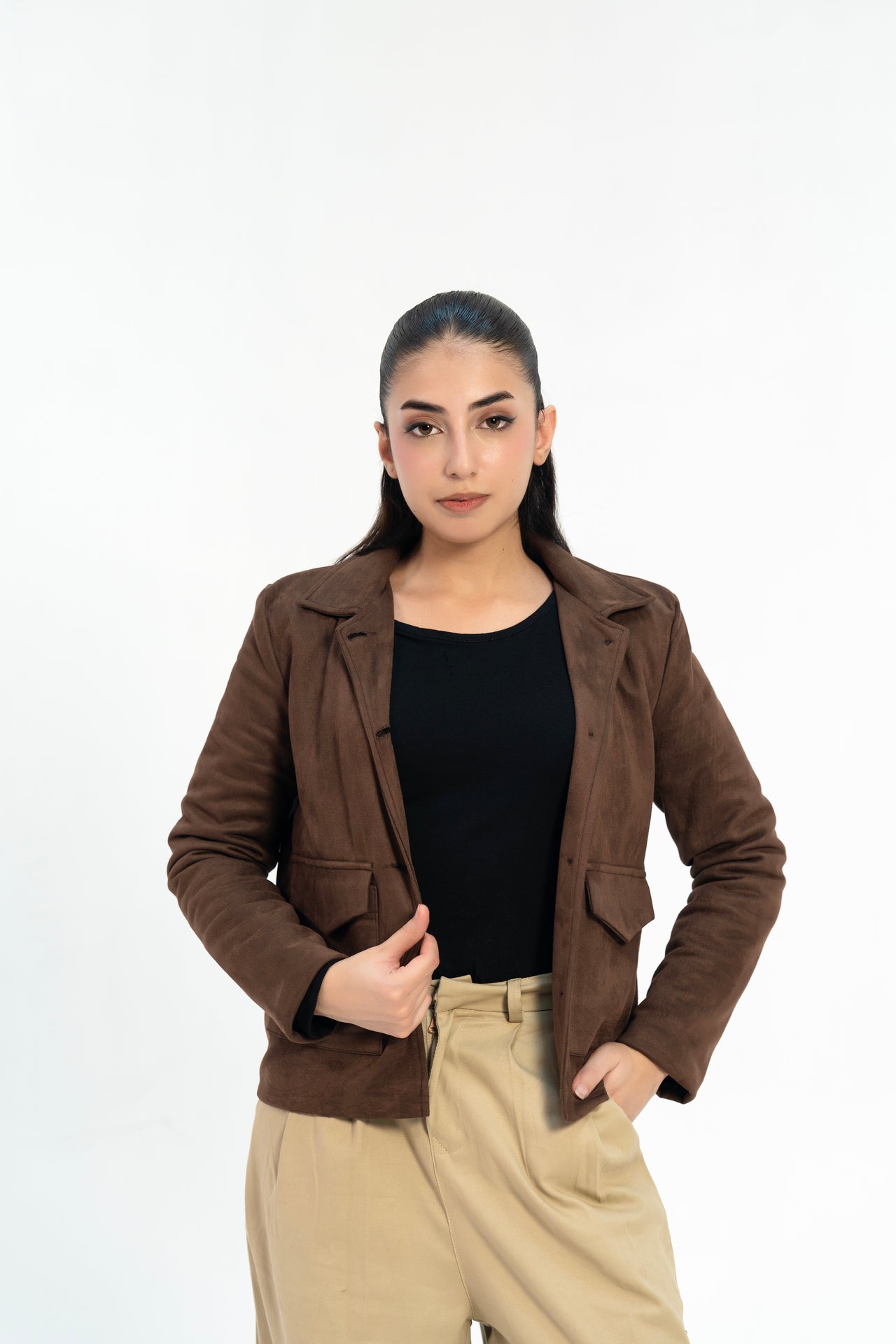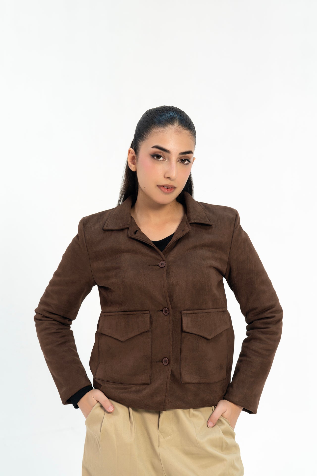 Suede Jacket with Patch Pocket - Chocolate Brown