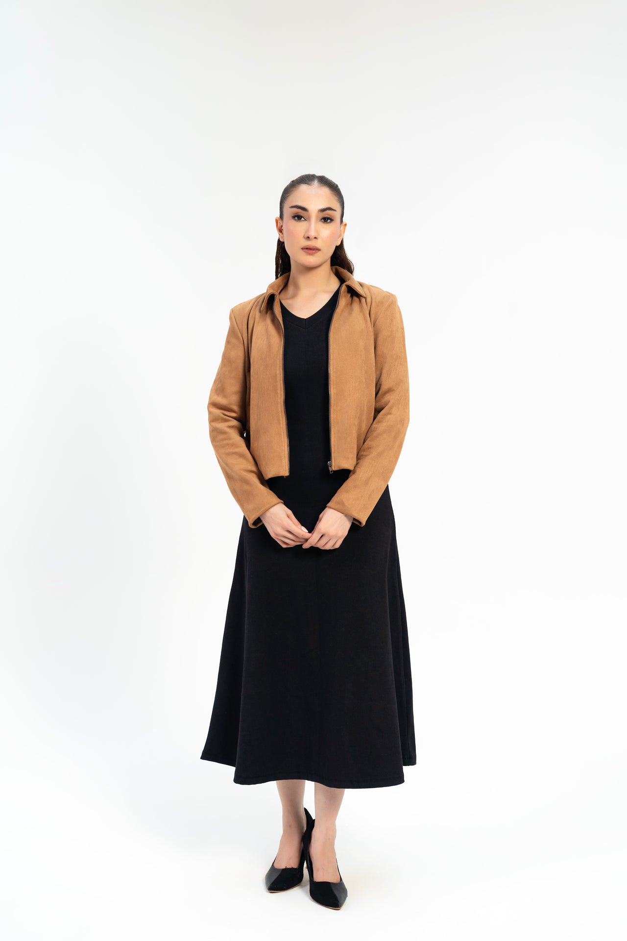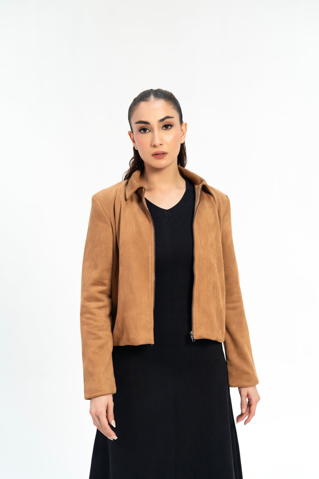 This camel suede jacket features a front zip closure and a classic collar for a polished look. Designed with a convenient size pocket and long sleeves, it offers both functionality and style. The jacket is fully lined, ensuring comfort and durability for everyday wear. Perfect for adding a sophisticated touch to your wardrobe.