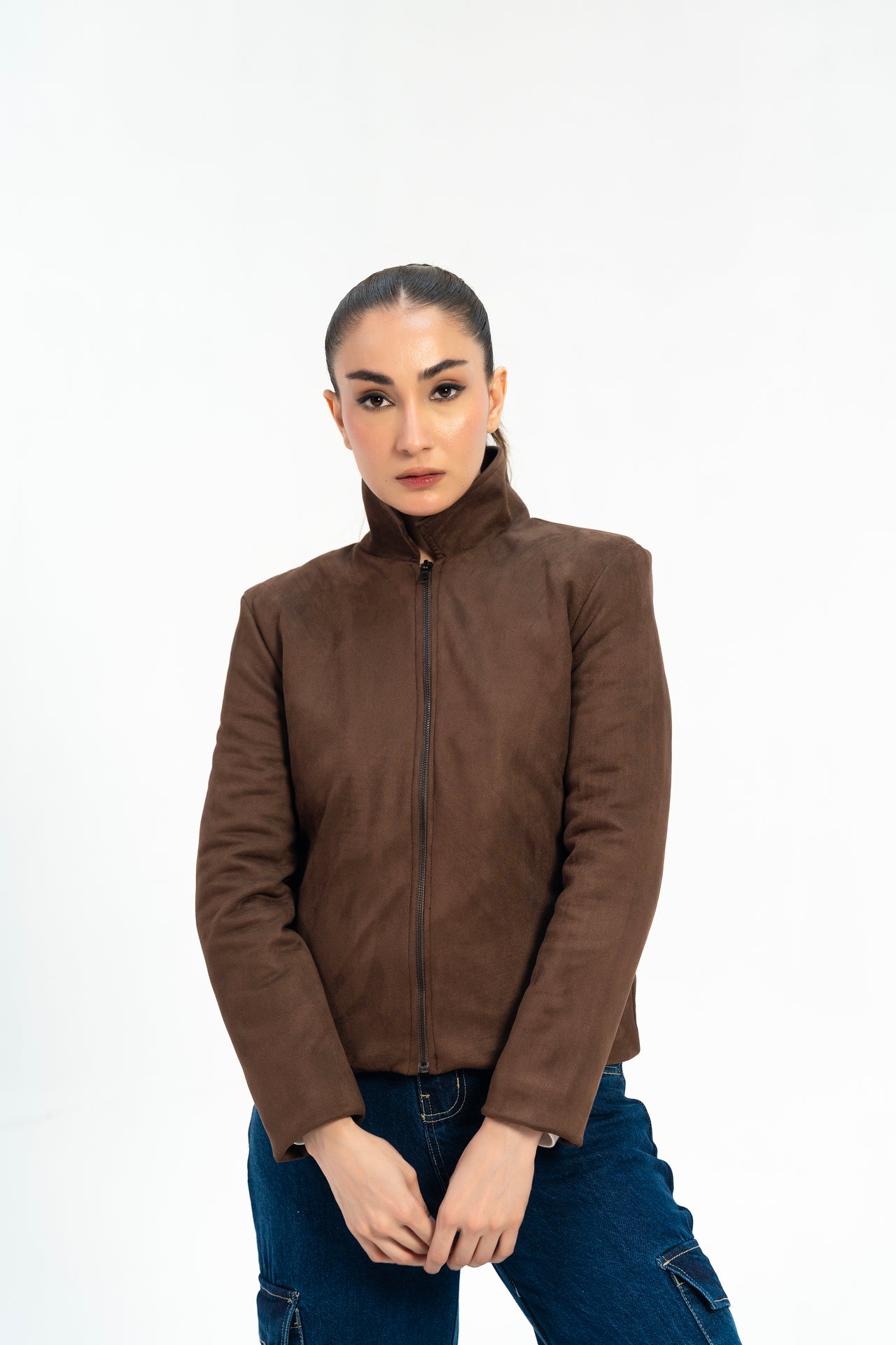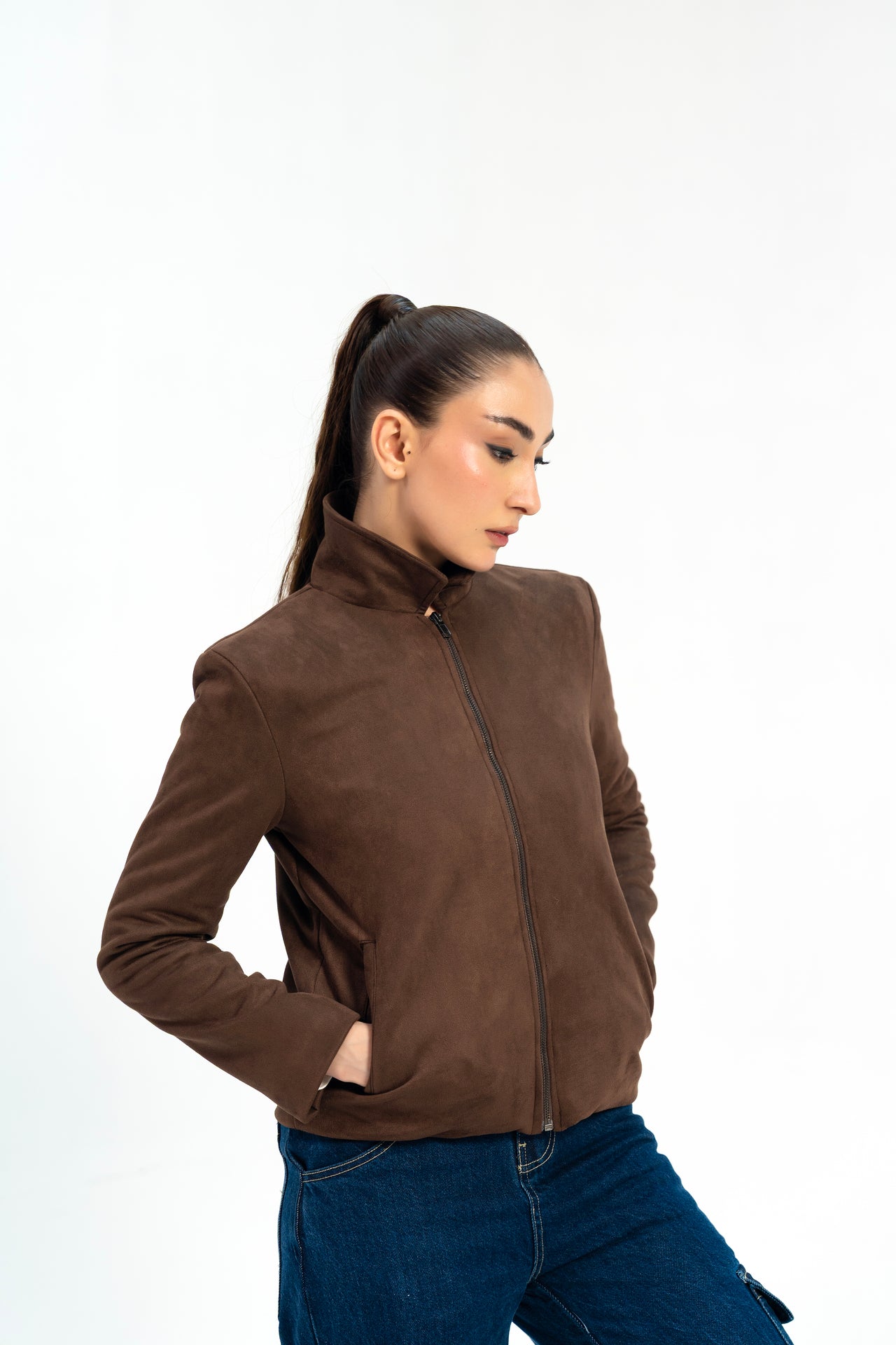 This chocolate brown suede jacket combines a sleek front zip closure with a classic collar for a timeless silhouette. Featuring long sleeves and a size pocket, it offers practicality without compromising style. Fully lined for enhanced comfort and longevity, this jacket is expertly crafted for those seeking refined outerwear with durable performance.