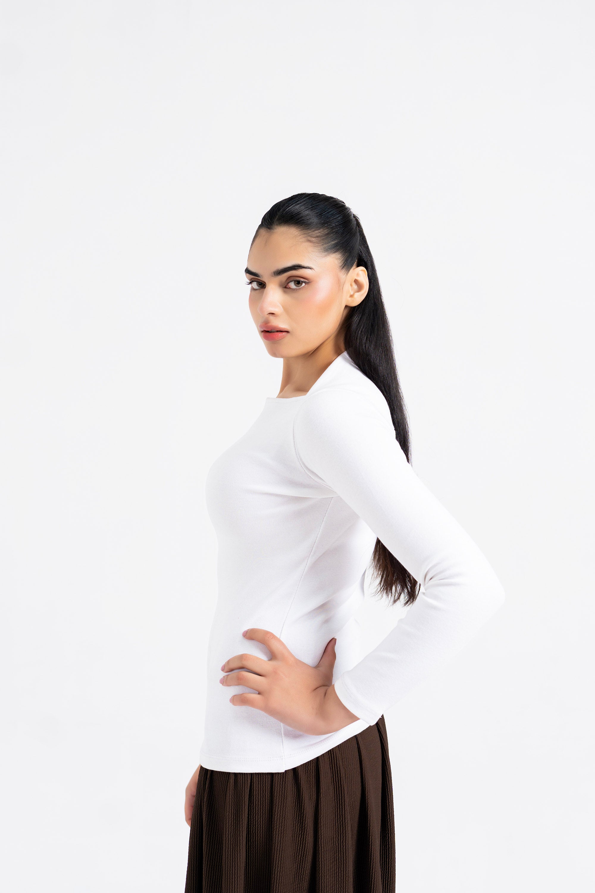 Square Cut Ribbed Top in crisp white features a distinctive square neckline and long sleeves for versatile layering. The ribbed fabric provides structure and comfort, making it an essential piece for any wardrobe. Perfect for casual wear or styled under jackets for added dimension.