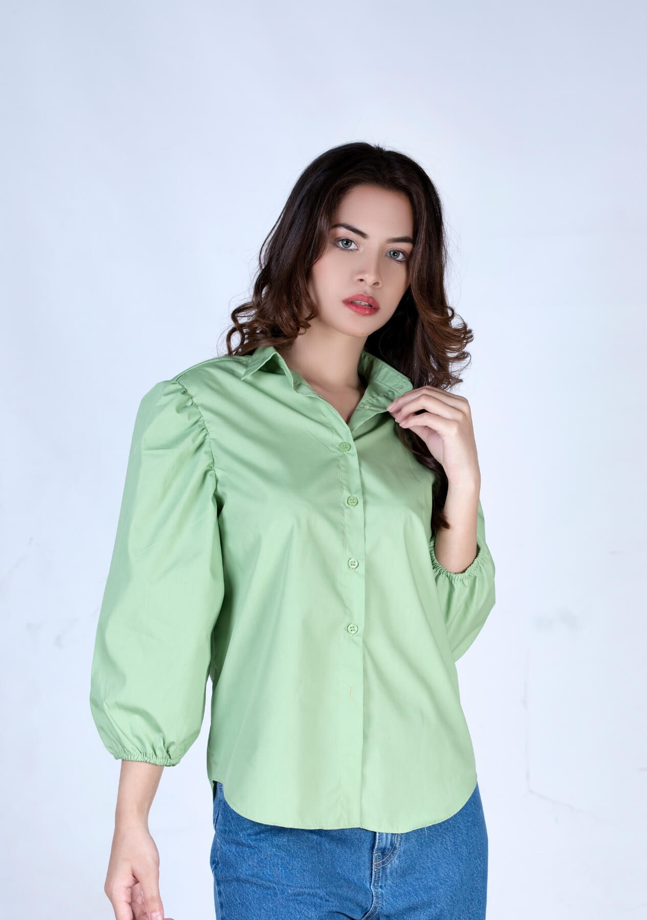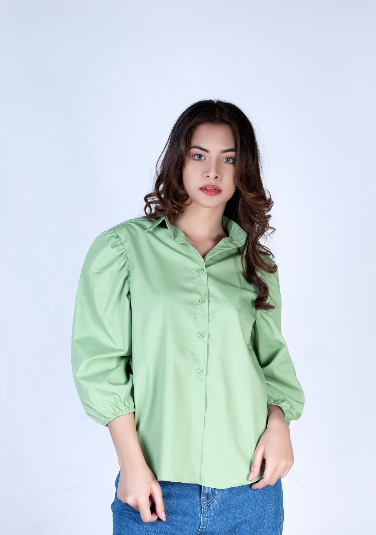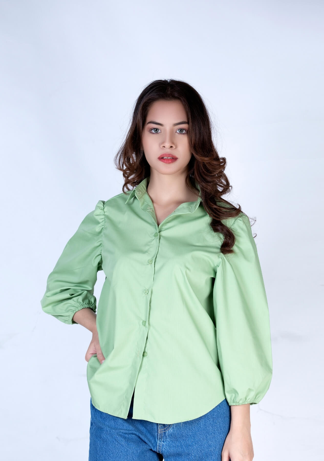 This exceptionally soft puff sleeve poplin shirt includes feminine pleated sleeves and a flattering classic collar. The puff sleeves give it a flattering and sleek fit making it perfect for tucking into high-risers and skirts alike.