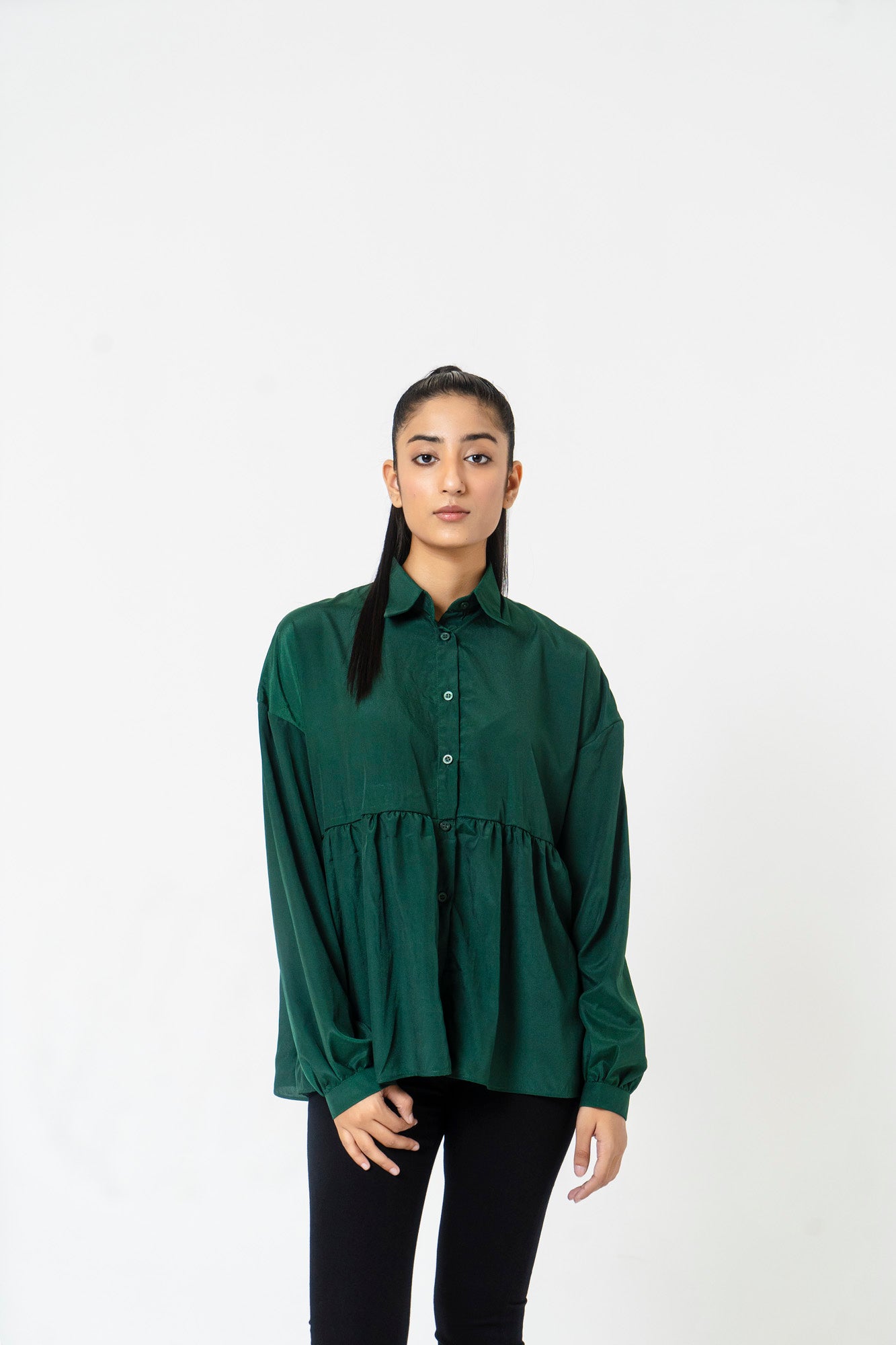 This Collared Ruffle Shirt in Bottle Green is the perfect addition to your wardrobe. This timeless piece features a collared neckline, a classic front button opening, full sleeves, a cuff hem, and a stylish ruffle detail. It's the perfect balance of sophistication and contemporary style.