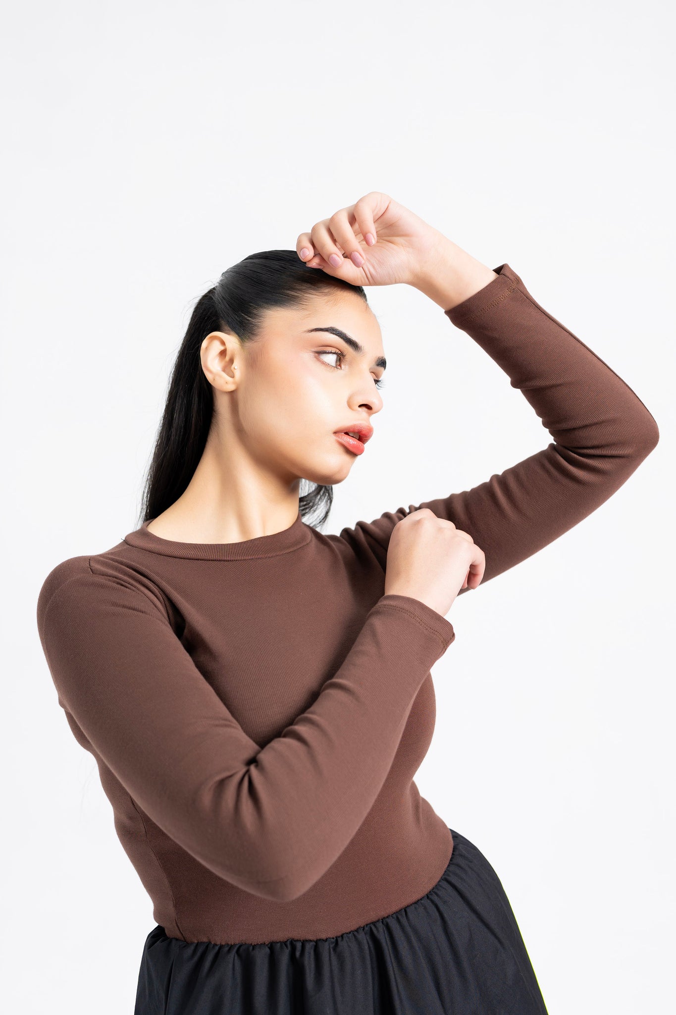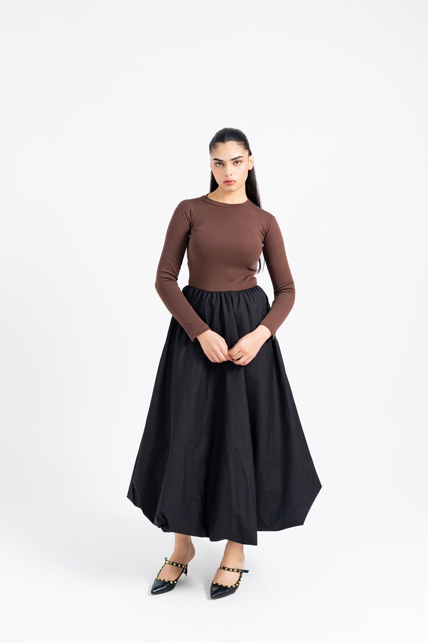 Designed for everyday elegance, this ribbed bubble hem dress features a fitted bodice paired with a sculpted skirt for a balanced and flattering silhouette. The full sleeves and round neckline provide comfortable coverage, while the contrast of brown and black adds a modern, versatile touch. Easy to wear and effortless to style, this dress works perfectly for daily wear and casual outings.