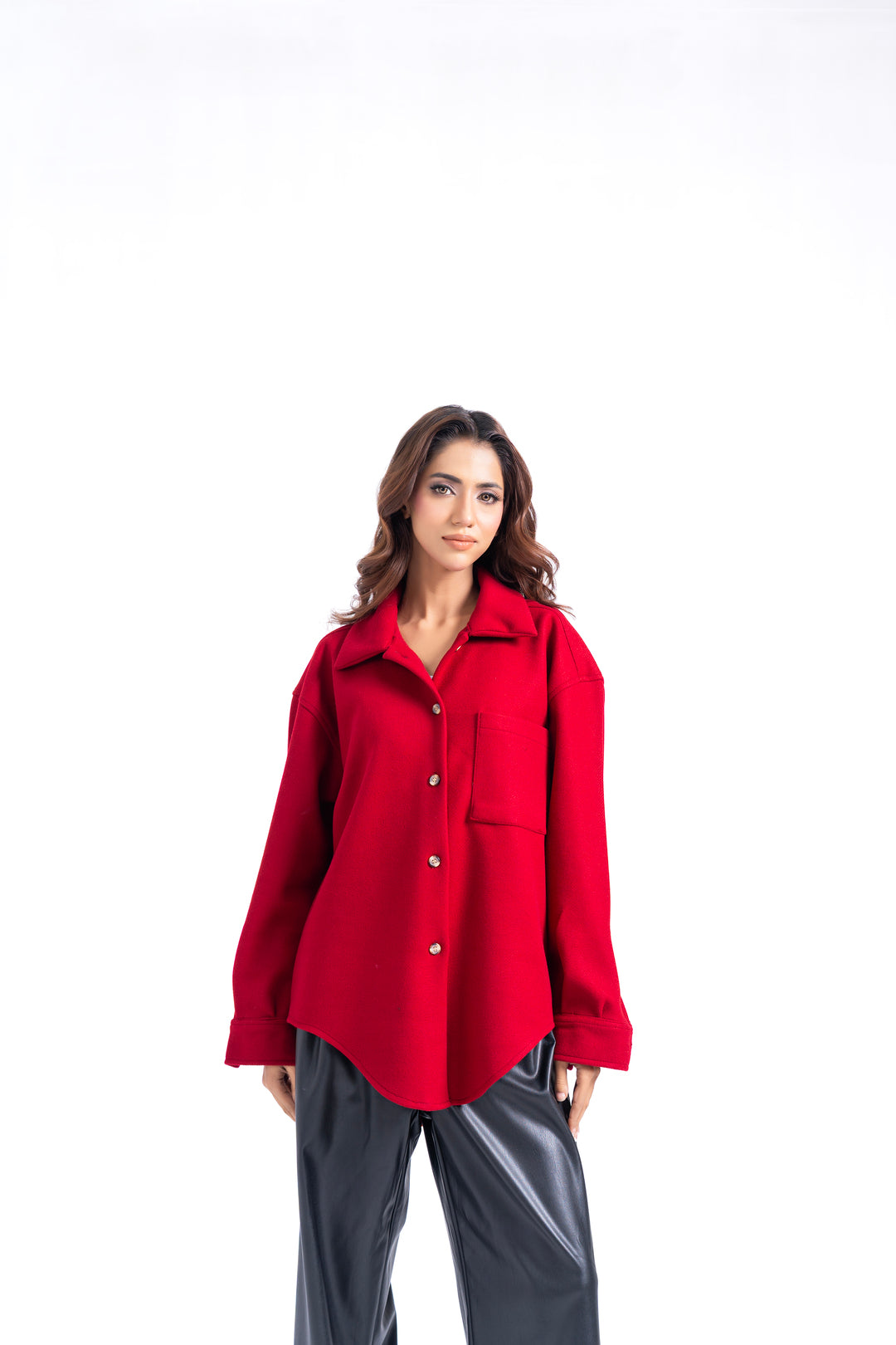 Expertly crafted oversized shacket in rich maroon wool. Features a structured collar, curved hem, and discreet back pleat for refined silhouette. Long sleeves with button cuffs, front patch pocket, and full button-up closure. A versatile layering piece that bridges casual and polished aesthetics.