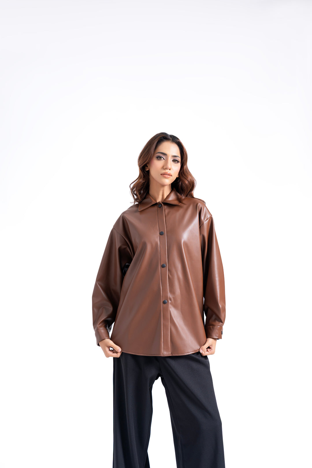 Make a bold statement in this brown faux leather oversized shirt. Designed with a crisp collar, full button front, and buttoned cuffs, it combines structure with contemporary ease. The back pleat adds subtle movement and dimension, while long sleeves provide versatile styling options. Perfect for layering or wearing solo as a standout piece.