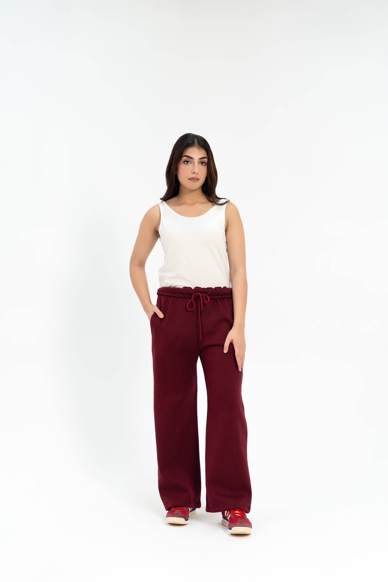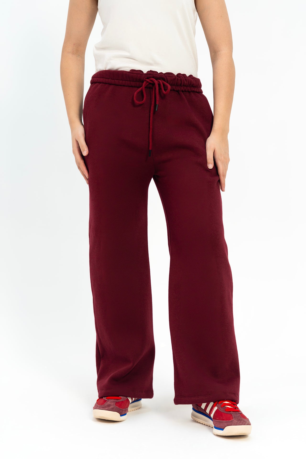 Crafted from cozy fleece, these burgundy sweatpants feature a straight wide-leg silhouette for comfortable movement. The inside drawstring ensures a secure, adjustable fit, while side pockets offer practical storage. Ideal for relaxed wear with a polished touch.