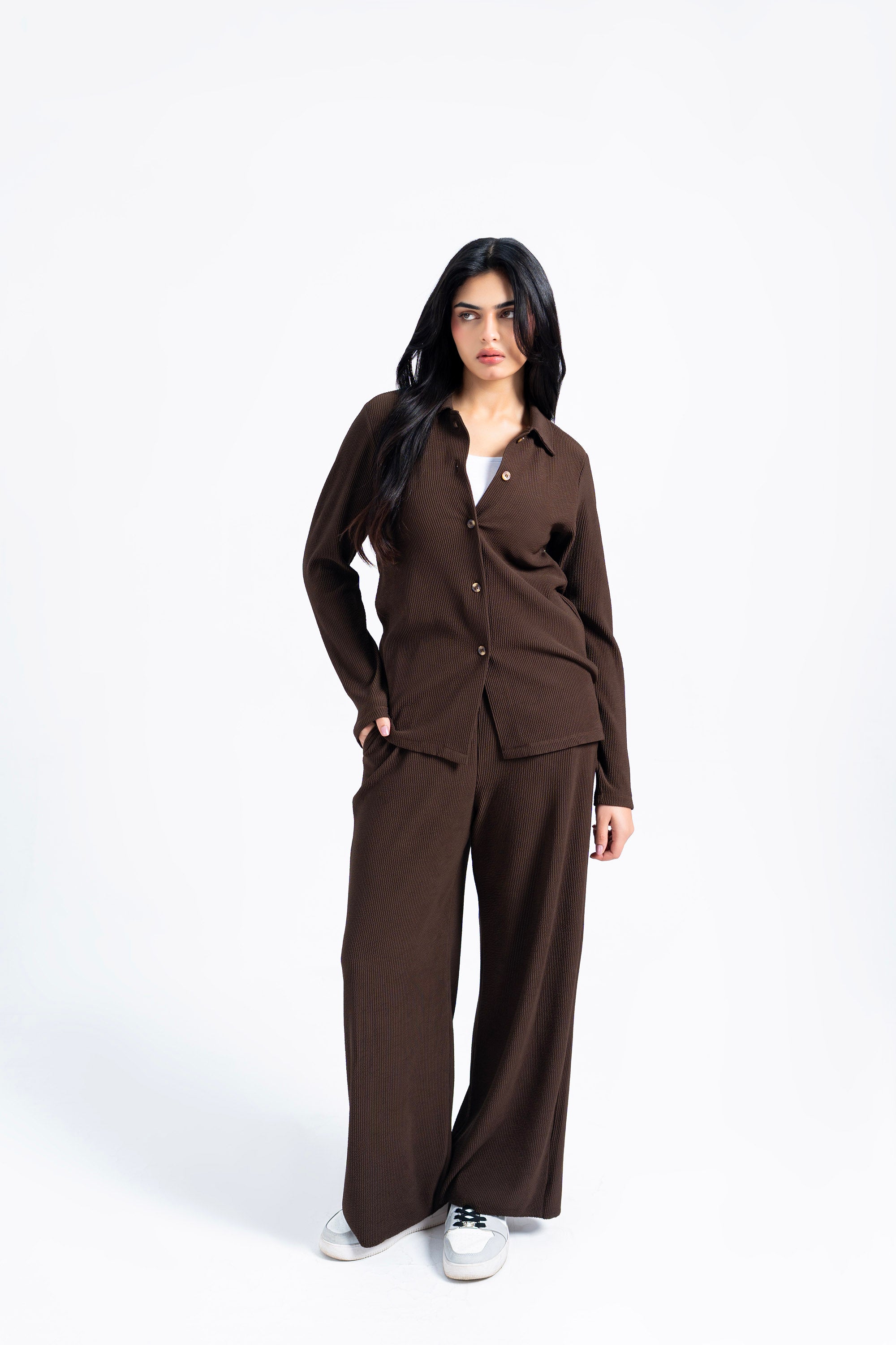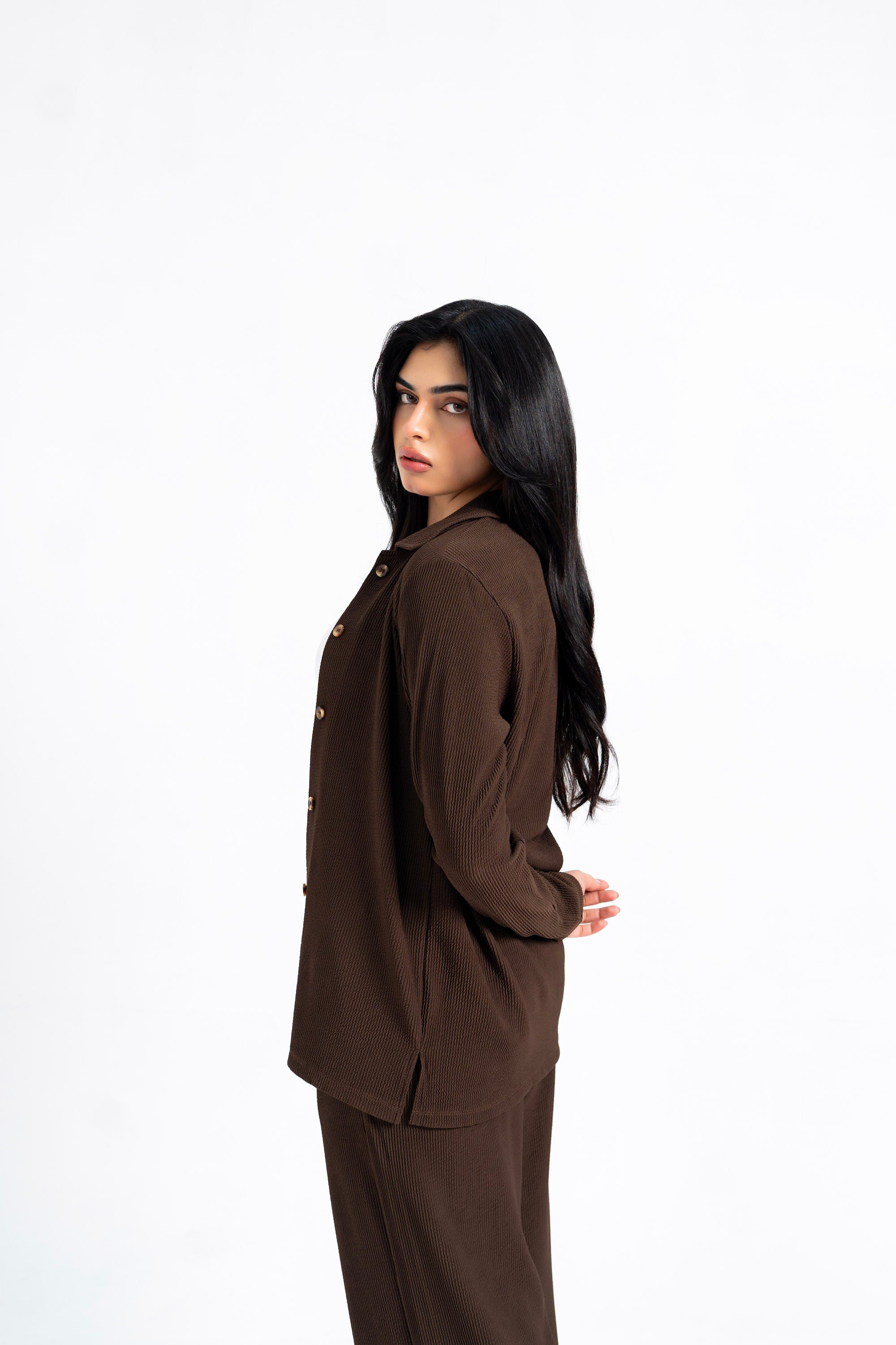 Discover understated sophistication with this textured button-down top in warm mocha brown. Designed with a structured collar and extended sleeves finished with buttoned cuffs, it offers refined practicality for discerning wardrobes. The front button closure provides flexible styling options—fasten completely for a crisp, professional appearance or unbutton selectively for a more relaxed aesthetic.